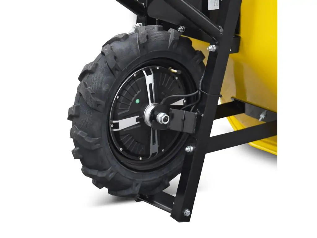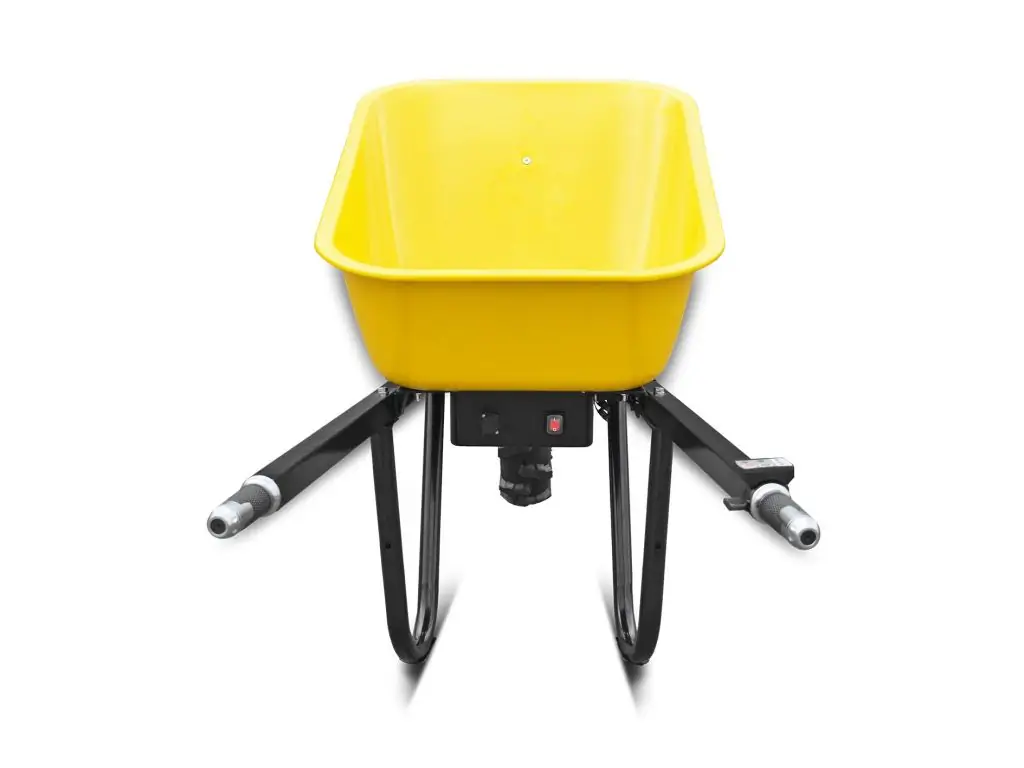 Стійкий до корозії і пошкоджень кузов має об’єм 75 л. Передній і задній хід з плавним регулюванням швидкості дозволяють зручно маневрувати в обмеженому просторі, а ідеально збалансований розподіл ваги і електромагнітне гальмо забезпечують повний контроль над рухом тачки. Велике колесо з вираженим протектором дає змогу без проблем проїжджати по пересіченій місцевості. Міцна рама з квадратної сталевої труби гарантує високу зносостійкість, тому ця самохідна тачка на акумуляторі служитиме довго і надійно.