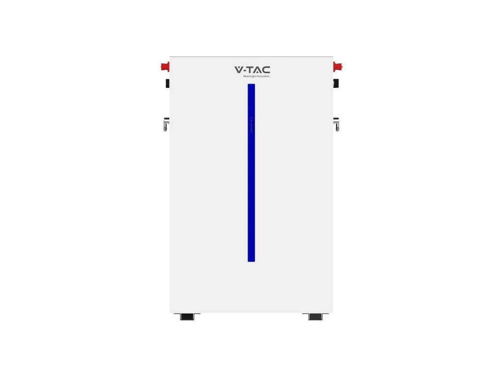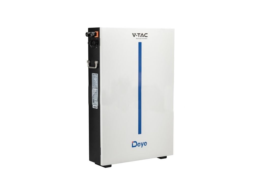 Накопичувач енергії V-TAC використовує літієву батарею з напругою 51,2 В та ємністю 100 Ач, призначену для фотоелектричних інверторів. Цей накопичувач дозволяє зберігати електроенергію до максимальної ємності 6,14 кВт·год. Він сумісний з інверторами DEYE та більшістю низьковольтних інверторів. У комплекті йдуть повний кабель і BMS (Battery Management System). Також передбачена можливість розширення кількості накопичувачів до 16 штук.