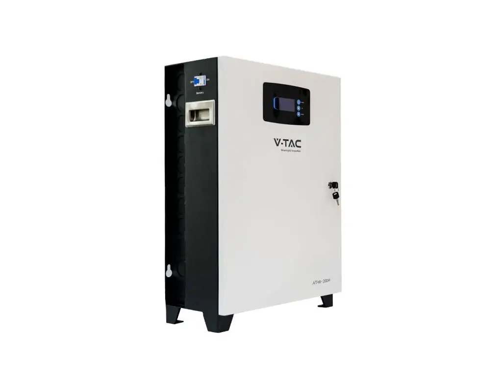 LiFePO4 енергонакопичувач V-TAC для фотоелектричних інверторів здатний зберігати електроенергію до максимальної потужності 10,24 кВт·год. Він має тривалий термін служби, здатний здійснювати більше 5000 циклів зарядки/розрядки. Модель оснащена кронштейнами для настінного кріплення і фронтальним світлодіодним дисплеєм, що дозволяє швидко контролювати параметри і стан батареї.