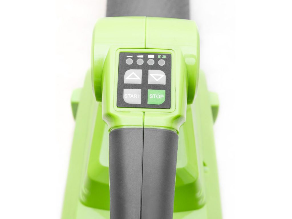 Пристрій видує потужний потік повітря і змітає відходи. Є повністю автономним за рахунок акумуляторного джерела живлення з напругою 40В. З таким обладнанням можна забути про обмежену дальність роботи та вихлопи.