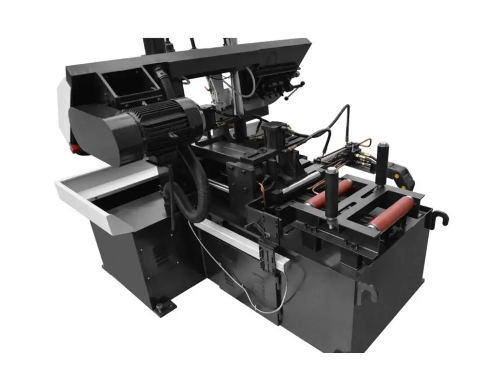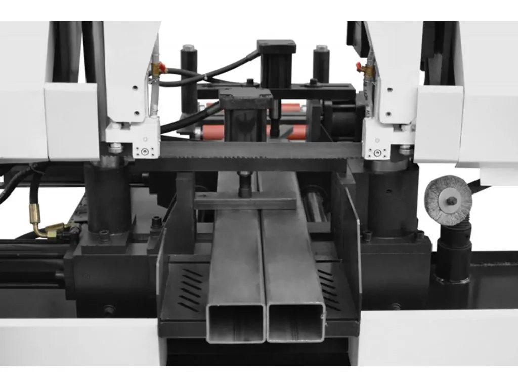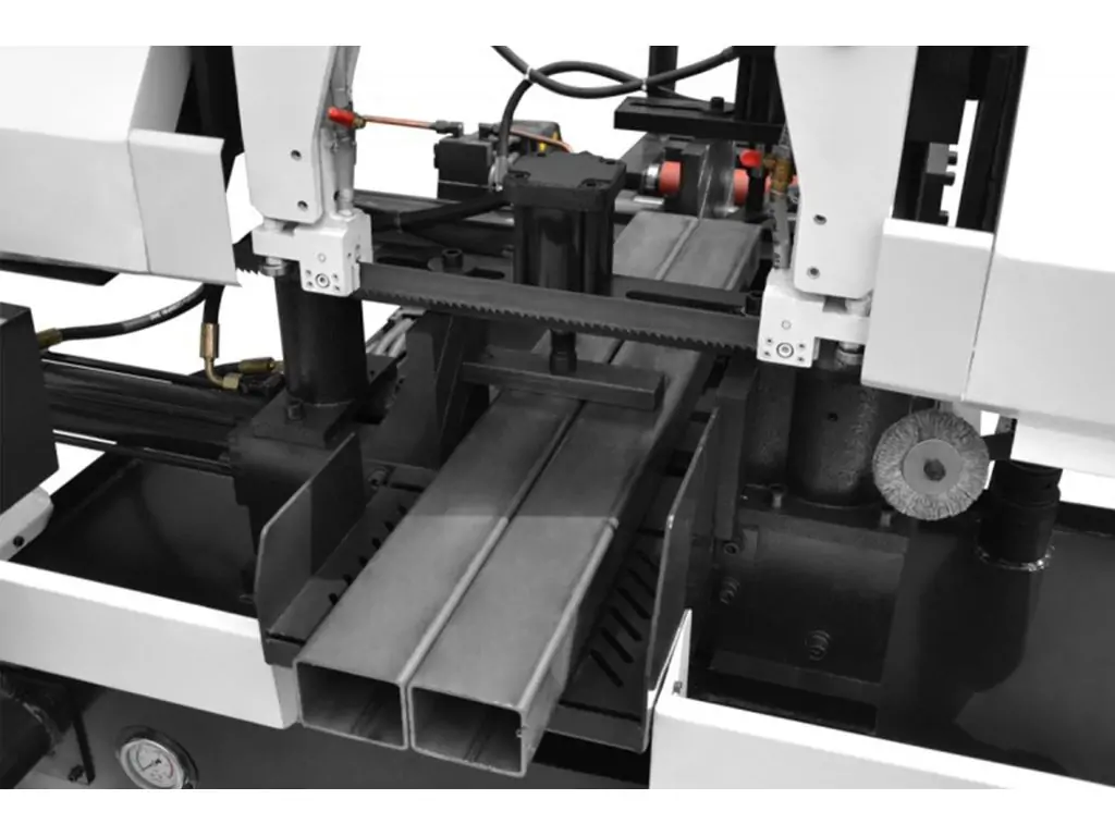 Завдяки двоколонній структурі та напрямним з підшипниками і твердосплавними вставками навантаження на полотно розподіляється рівномірно і мінімізуються бокові відхилення стрічки, що забезпечує рівний різ по всій довжині деталі. Автоподача заготовки і повністю автоматичний цикл різання роблять роботу надзвичайно швидкою і продуктивною. 3-ступеневе регулювання швидкості руху стрічки (40/ 60/ 80 м/хв) дає змогу вибрати оптимальний режим для конкретного матеріалу. Цей стрічкопильний верстат по металу автомат буде ефективним рішенням для серійного виготовлення великої кількості ідентичних деталей, серійних відрізів стандартних довжин і підприємств з великим потоком замовлень.