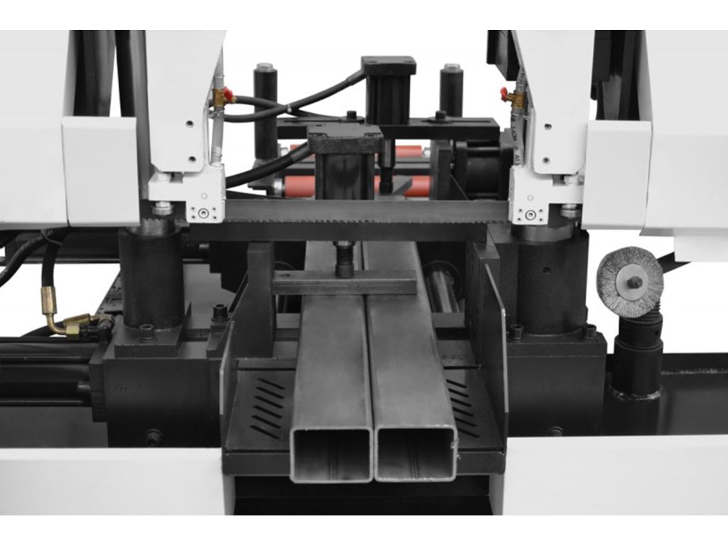 На стрічково-пильному верстаті встановлені подвійні лещата, одні використовуються для затискання при розпилюванні, другі для подачі заготовки на заданий розмір. Довжина подачі контролюється ультрафіолетовим датчиком руху, який контролює нульову точку та величину переміщення заготовки.