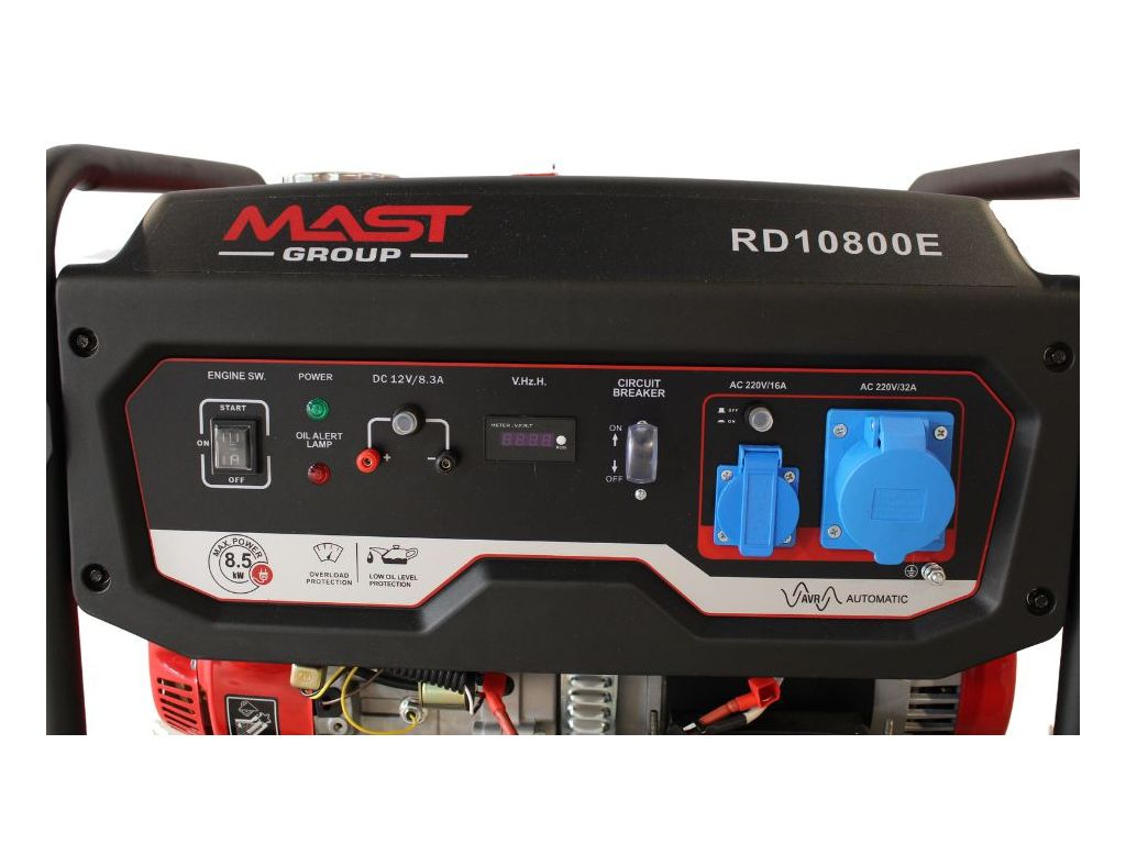 Бензиновий генератор MAST GROUP RD10800E призначений для постійного, резервного і аварійного живлення приватних будинків, торгових точок, закладів громадського харчування, офісів і невеликих виробництв. Також може використовуватися як мобільше джерело електроенергії для комунальних і дорожніх служб. Номінальна потужність - 8 кВт, вихідна напруга 230 В.
