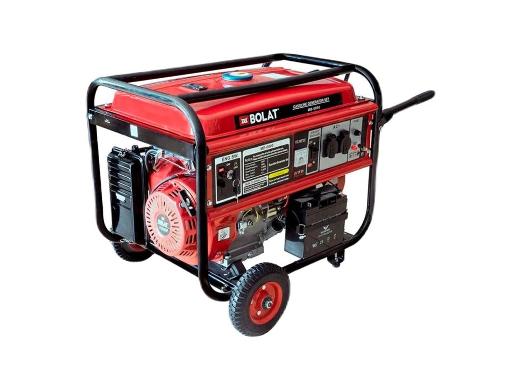 Бензиновий генератор Bolat MB-6000 призначений для використання у якості резервного джерела живлення приватних будинків, офісів, торгових точок й інших житлових і комерційних об’єктів. Також може використовуватися як мобільне джерело електроенергії для комунальних і дорожніх служб. Номінальна потужність становить 5 кВт, що є достатнім для забезпечення роботи більшості приладів. Потужний бензиновий двигун із захистом від перегріву і ємність паливного бака 26 л забезпечують безперервну роботу генератора до 7 годин. Генерує вихідну напругу 230 В. Простий у використанні та легкий в обслуговуванні.