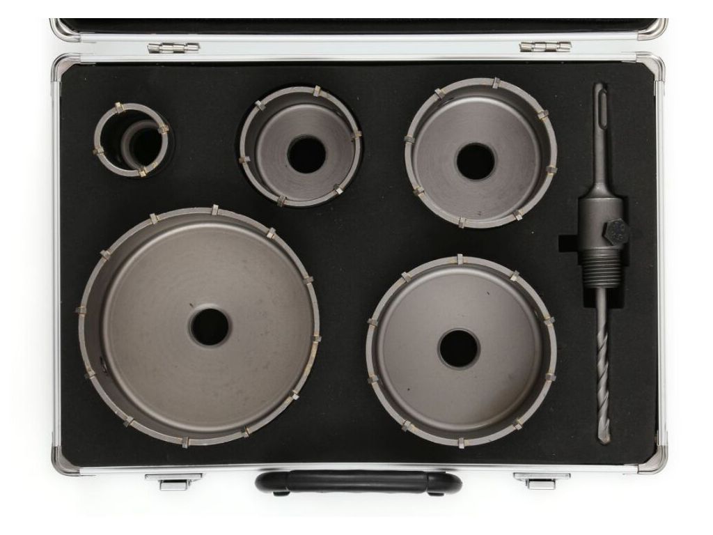 Набір кільцевих коронок для бетону SDS Plus і SDS Max TAGRED TA1510 - виготовлений зі сталі найвищої якості, а вилка - з дуже твердого матеріалу - карбіду. Завдяки адаптеру коронки можна встановлювати в стандартні патрони SDS-PLUS. Адаптери також підходять для встановлення в стандартні затискні головки. Весь набір укладений в дуже естетичний і функціональний кейс для зручного зберігання і транспортування інструментів.