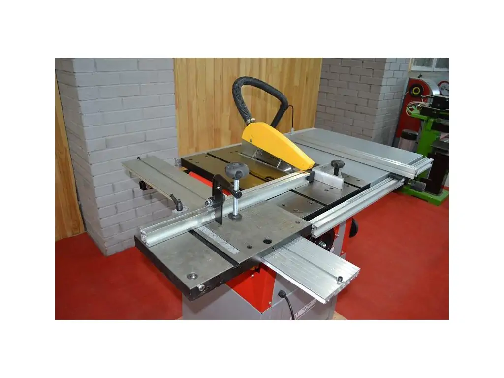 - Чавунна каретка з упорною лінійкою, відкидним упором і затиском заготовки, яка переміщується по алюмінієвій напрямній на 4 поліуретанових роликах