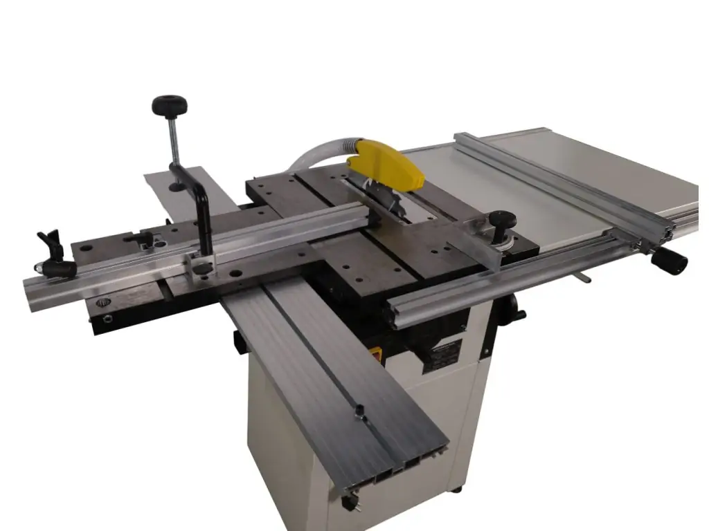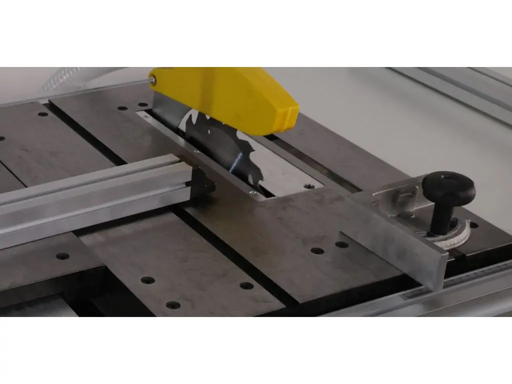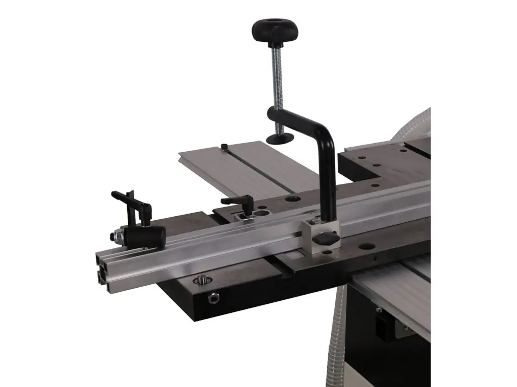- Перпендикулярний упор оснащений притиском і регулюється по куту відносно пильного диска за допомогою лінійки на рухомому столі