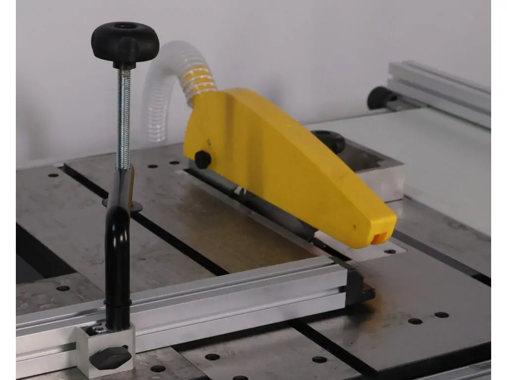 - Перпендикулярний упор має притиск і рухається по куту відносно пильного диска за допомогою розміщеної на рухомому столі лінійки