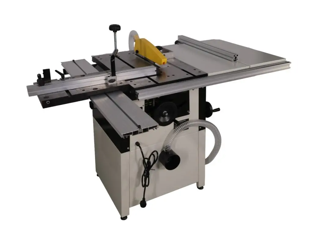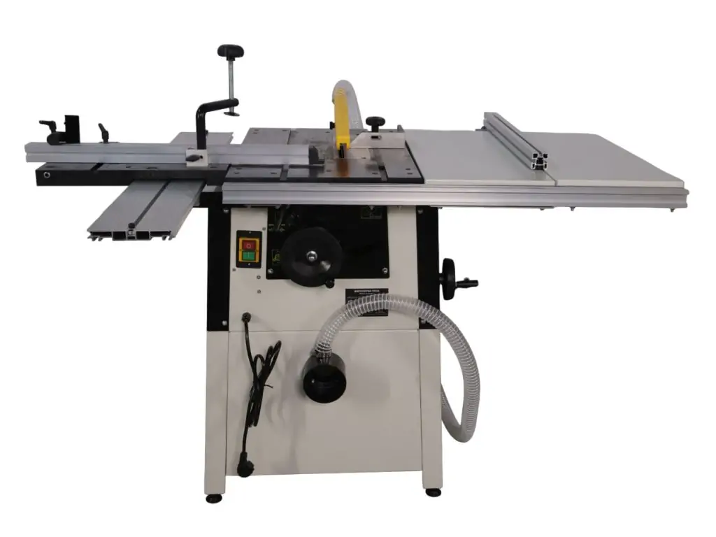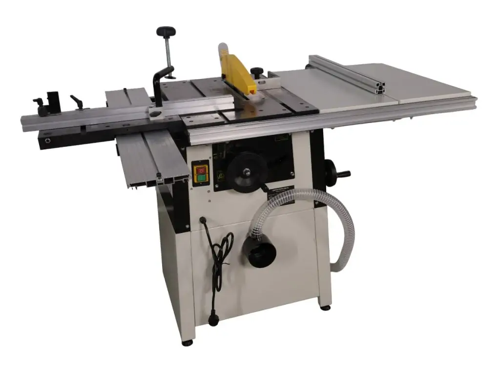 Нахил і висота пильного диска регулюються за допомогою маховика. Нахил диска на 45° дозволяє якісно виконувати різання під кутом. Чавунний робочий стіл стійкий до навантажень, а розширення по довжині і ширині дають можливість працювати з великими і нестандартними заготовками.