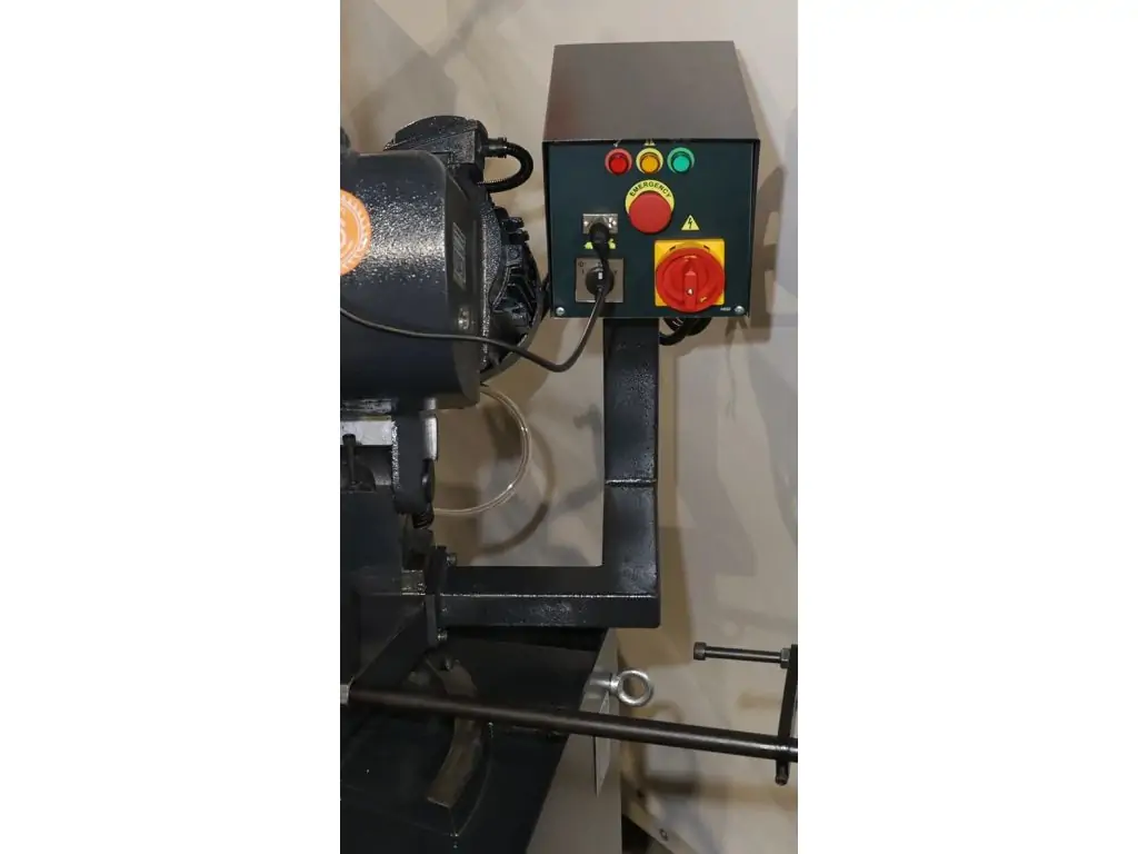 Верстат має компактну, суцільнометалеву конструкцію, а швидкознімний корпус щитка дозволяє легко замінити ріжучий диск. Пильна голова має кут повороту 45°, який регулюється за допомогою ручки на передній частині верстата. Захисний кожух забезпечує чистоту робочої зони та надійно захищає оператора. Потужність двигуна 2,2 кВт забезпечує продуктивну, довготривалу роботу.