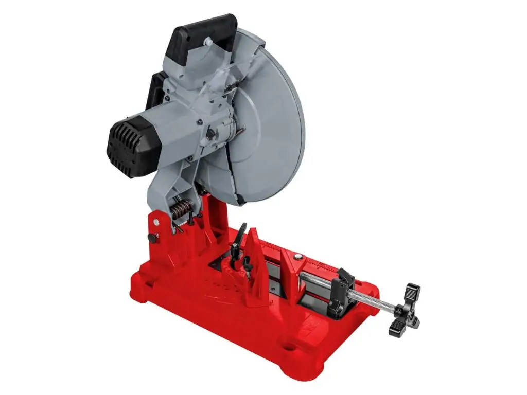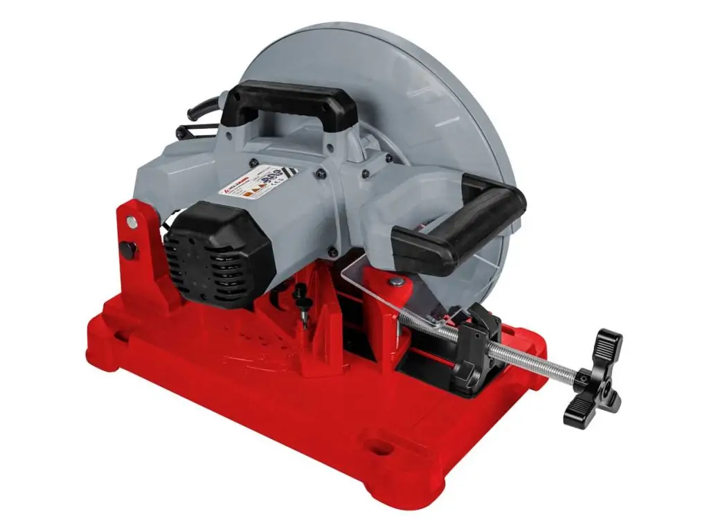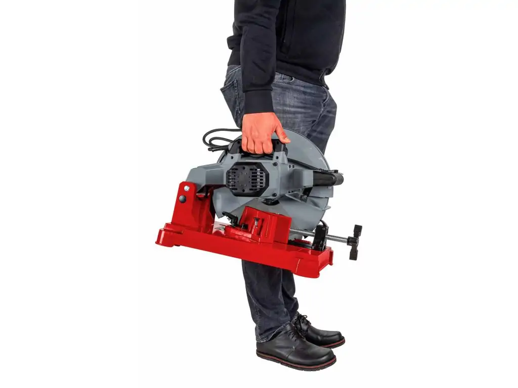 Подача диска на заготовку здійснюється вручну за допомогою важеля. Для надійної фіксації заготовки використовуються швидкорегульовані лещата з гвинтовим затиском. Лещата встановлені на поворотній платформі з градусною шкалою, завдяки чому ця мобільна пила по металу дозволяє виконувати різи під кутами від 0 до 45°. Компактна конструкція і ручка для транспортування роблять її відмінним рішенням для виїзних робіт.