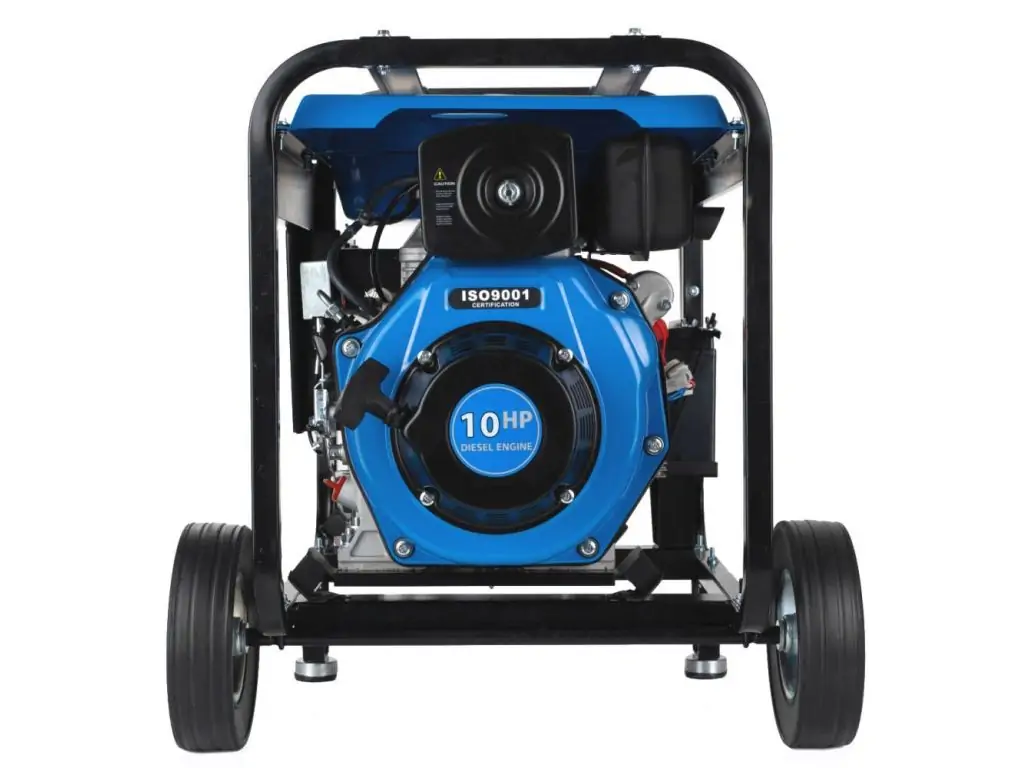 1-циліндровий, 4-тактний дизельний двигун потужністю 7,4 кВт/10 к.с. забезпечує високий крутний момент, що дозволяє легко запустити прилади з високим пусковим струмом. Для полегшення запуску генератора є електростартер і ручний стартер. Об’єм паливного бака 13 л і економічне споживання палива дозволяють безперервну експлуатацію до 6 годин. Для зручності переміщення цей дизель-генератор однофазний оснащений колесами і ручкою.