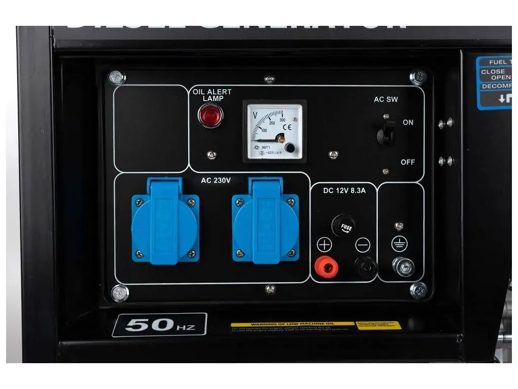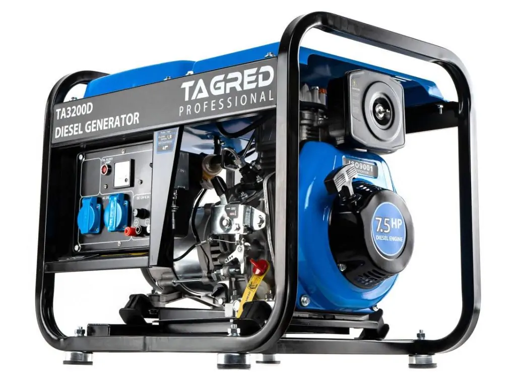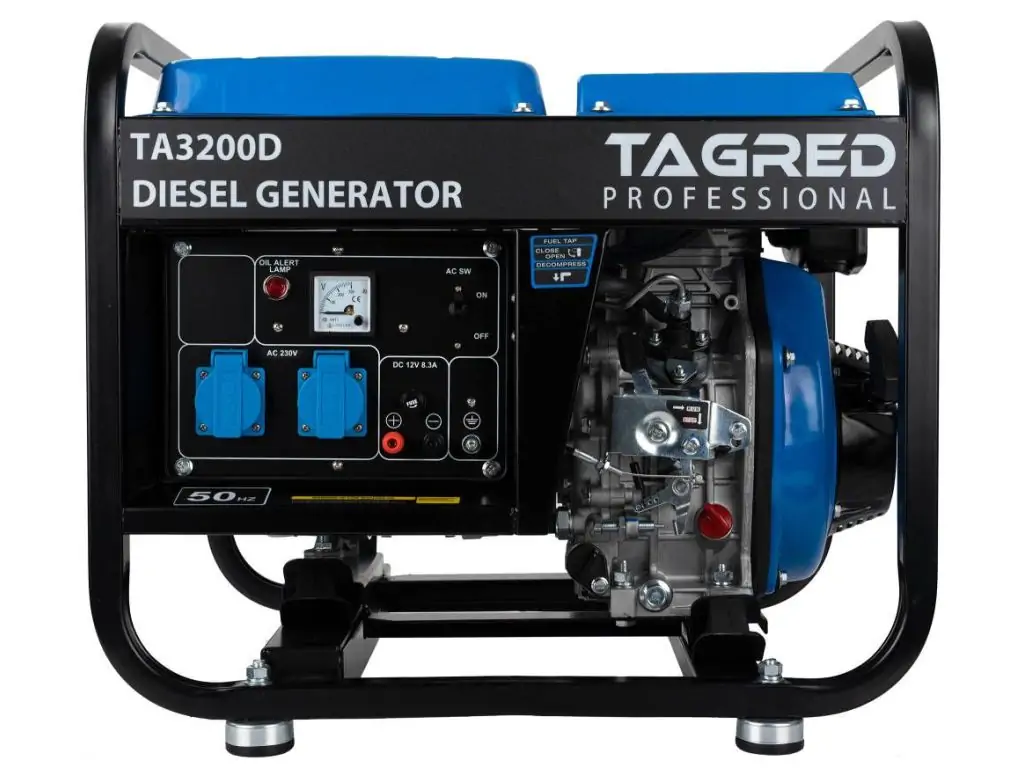 Дизельний генератор TAGRED TA3200D з номінальною потужністю 2,9 кВт і вихідною напругою 230 В відмінно підходить для резервного живлення побутових приладів та електроінструментів при відключеннях електроенергії або відсутності електромережі. 2 розетки 230 В/16 А та вихід 12 В дозволяють одночасно підключати кілька пристроїв. Одноциліндровий, чотиритактний дизельний двигун потужністю 5,5 кВт/ 7,5 к.с. економно споживає паливо і дає сильний тяговий імпульс, що дозволяє без проблем запускати прилади з високим пусковим струмом. Низький розхід палива і об’єм паливного бака 13 л забезпечують безперервну роботу до 6 годин на одній заправці.
