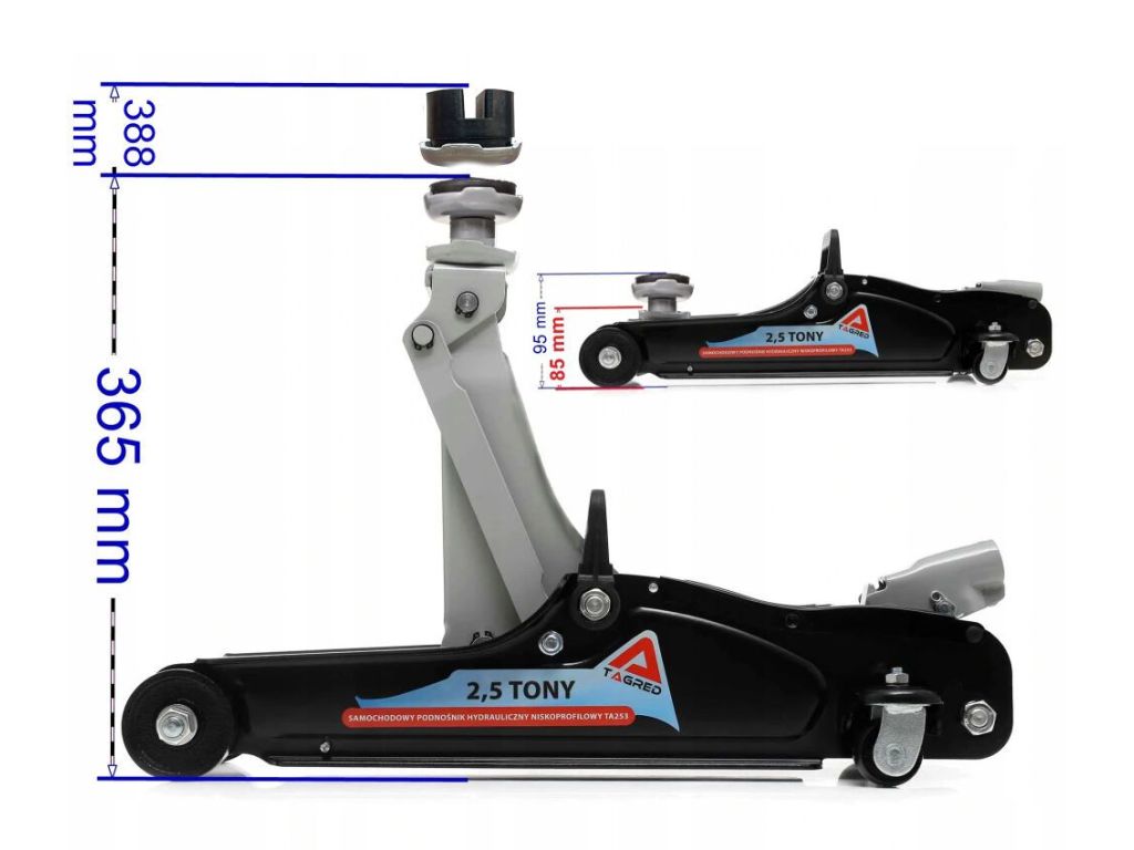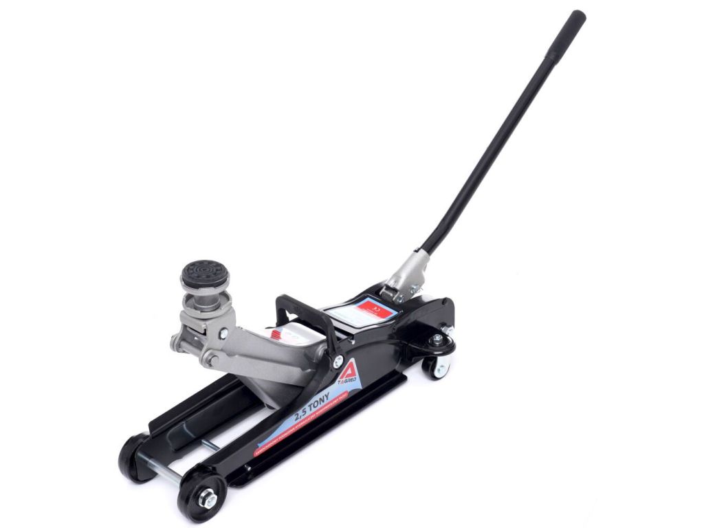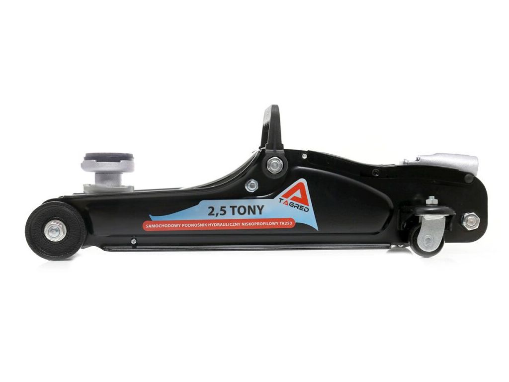 Автомобільний домкрат-жаба TAGRED TA253 з вантажопідйомністю 2,5 тонни, міцною, надійною конструкцією, знімною ручкою та колесами буде вдалим придбанням для СТО, шиномонтажів та використання у власному гаражі. Поставляється з гумовою накладкою для захисту порогів авто і запобігання ковзанню піднятого автомобіля. Підходить для обслуговування більшості легкових автомобілів та мікроавтобусів, а висота підхоплення всього 85 мм без накладки і 95 мм з накладкою дозволяє працювати з низькими авто. Забезпечує максимальну висоту підйому 355 мм без накладки і 388 мм з накладкою.