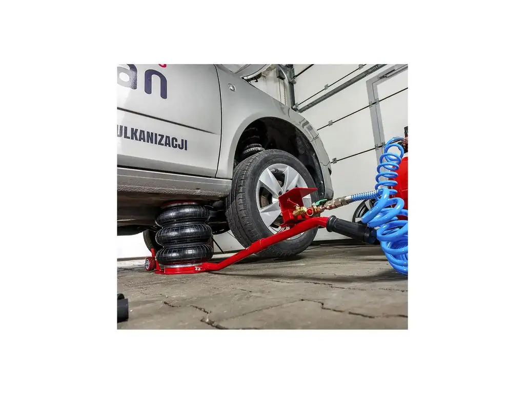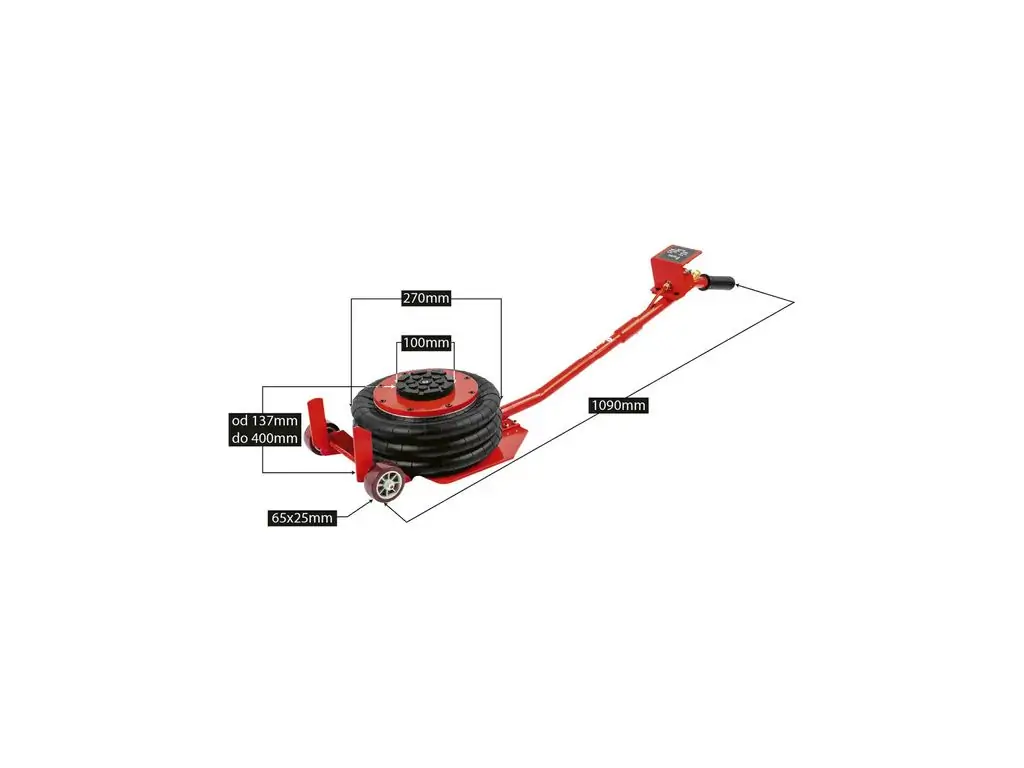 Сильфон має діаметр 270 мм і виготовлений з багатошарової армованої гуми, що забезпечує його герметичність і стійкість до зношування. В комплект поставки входить гумова накладка, яка запобігає ковзанню автомобіля при підйомі. Завдяки довгій ручці і великим колесам цей пневмоподушковий домкрат можна легко і точно позиціонувати під авто.