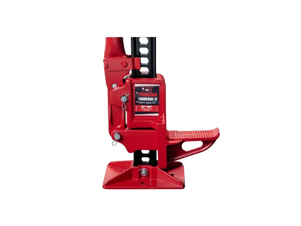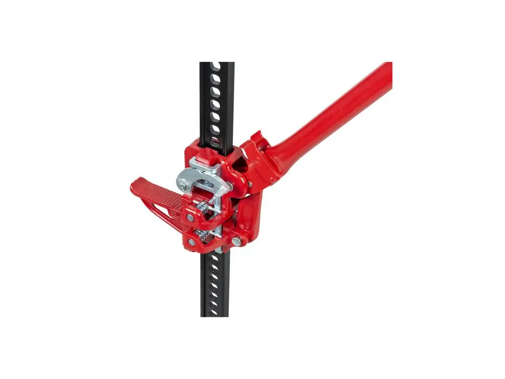 Перфорована сталева рейка дає великий хід підйому, сягаючи висоти 1320 мм. Отвори також дозволяють кріпити аксесуари або ланцюги. Велика довжина важеля зменшує навантаження на оператора при підйомі вантажу. Повністю механічний кроковий механізм підйому, який складається з двох подвійних сталевих штифтів, залишається надійним і безвідмовним навіть у важких умовах. Велика опорна п’ята робить домкрат більш стабільним на піску або м’якому грунті. Щелепу можна зняти або повернути, що перетворює цей домкрат для бездоріжжя у струбцину або лебідку. Конструкція виготовлена з міцної сталі та не має складної електроніки і гідравліки, що забезпечує високу зносостійкість і довговічність у важких умовах.