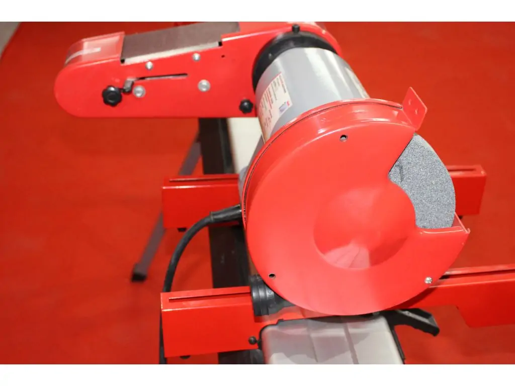 Верстат поставляється з універсальною шліфувальною стрічкою зернистістю 80 і шліфувальним кругом із зерном K36. Шліфувальні елементи можна легко замінити за допомогою спеціального важеля. Кут нахилу стрічкового блока регулюється від 0° до 90°, а тримач заготовки можна повертати до 45°. Литий чавунний корпус з високою вібростійкістю і промисловий дизайн забезпечують високу точність обробки. Для захисту вiд стружки та іскор є захисний щиток з плексигласу. Монтажні отвори в корпусі дозволяють надійно закріпити пристрій на поверхні, а компактний розмір і легке налаштування - використовувати цей настільний шліфувальний верстат по металу у будь-якому зручному місці.