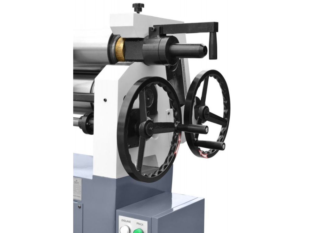 Ланцюговий привід передає обертання від електродвигуна до роликів. Верхній ролик відкидний, що дозволяє легко знімати готову продукцію. Відкидний ролик оснащений блокуванням, що запобігає його мимовільному відкриттю під час роботи.