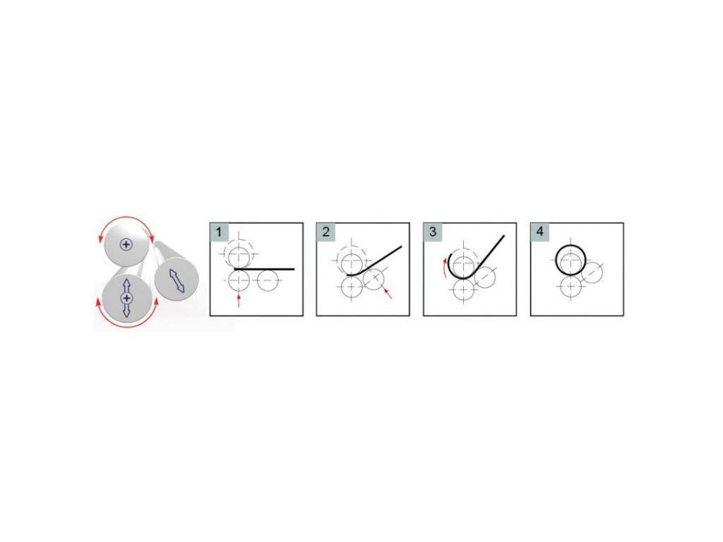 Верхній ролик відкидний, що дозволяє легко знімати готову продукцію. За рахунок маховиків здійснюється переміщення заднього та нижнього валків. Причому вали переміщаються паралельно до верхнього, що мінімізує перекоси і дозволяє прокатувати рівні циліндричні вироби.