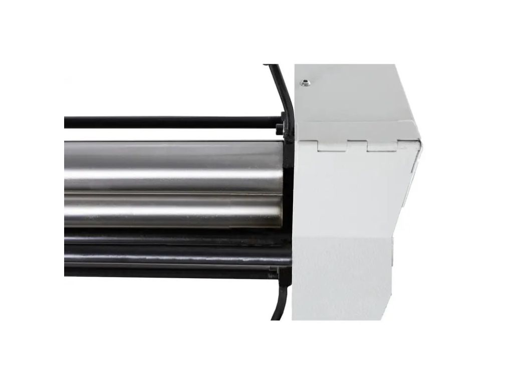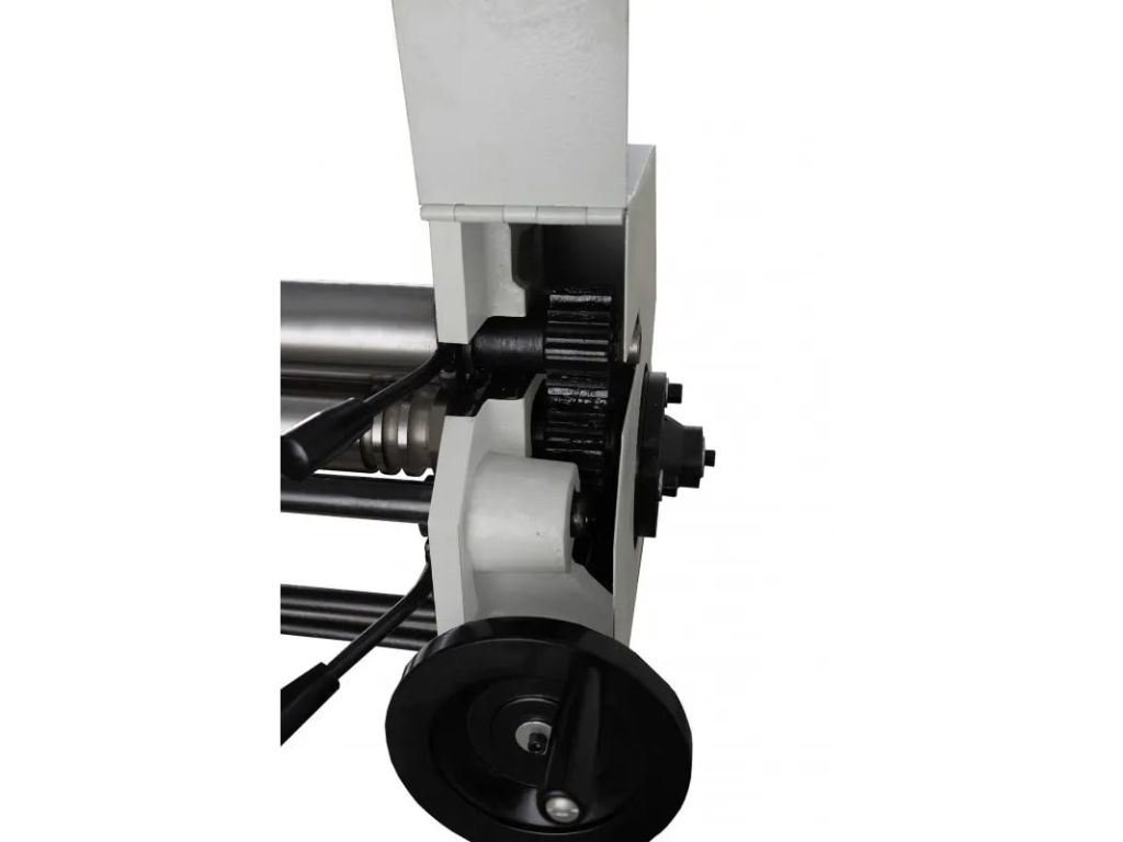 Верстат має міцну конструкцію, яка гарантує стабільність і довговічність навіть при інтенсивному використанні. Нижній і задні ролики оснащені з'єднувачем подачі, що забезпечує точність виконання робіт. Функцією обертання валків вправо або вліво зручно керувати за допомогою ножної педалі.