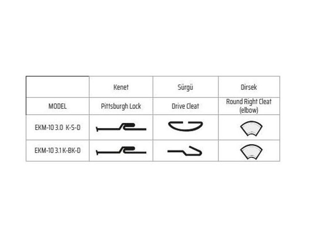 Кромкозагинальна машина з 7 робочими ділянками EKM 10 призначена для отримання замків на аркуші таких як: пітсбургський замок, сполучна рейка, силовий фланець, кругла пряма рейка, Z - образна рейка, прямий кут, стикова рейка, плоска Стикова планка, плоска планка.
