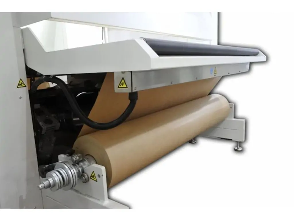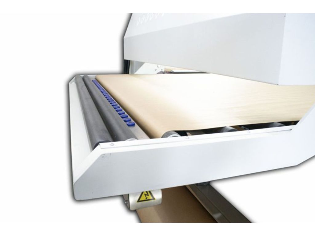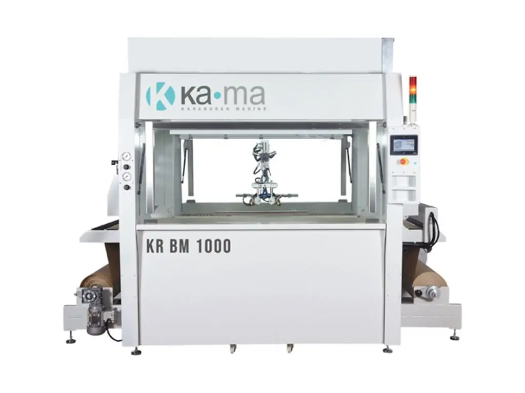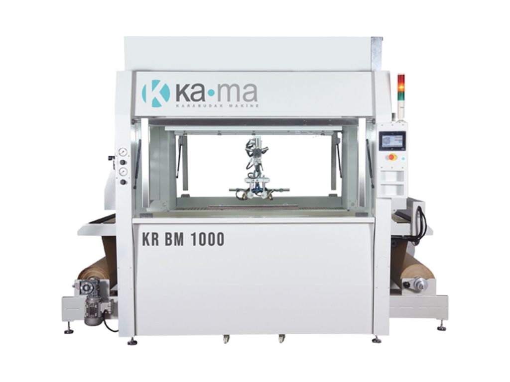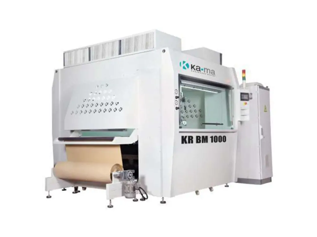KR BM 1000-K фарбує вироби на паперовій стрічці на стрічці вакуумного конвеєра. Паперова стрічка завжди натягнута, стійка і гладка (під час фарбування не мнеться) завдяки вакуумному конвеєру. Після процесу фарбування брудний папір вивільняється із системи завдяки механічному гальмуванню, при цьому легко намотується на рулон при виході з машини, завдяки системі намотування з регульованим крутним моментом.