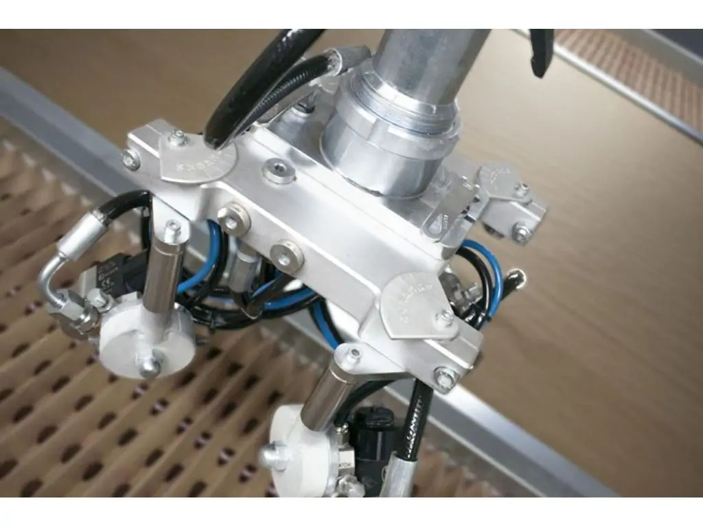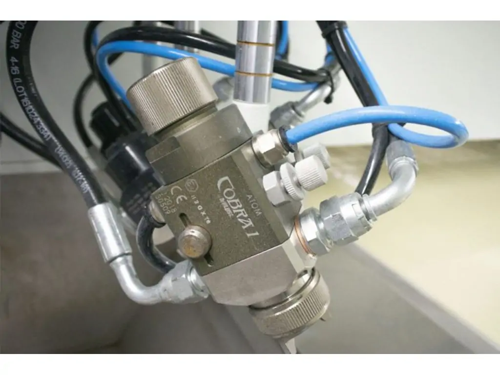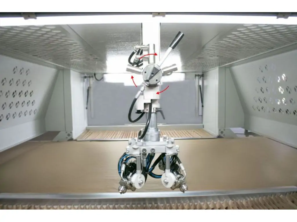 Машина має високорозвинену систему. Процес забарвлення здійснюється за допомогою робота-маніпулятора, розташованого в центрі і оснащеного 4-ма фарборозпилювачами високого тиску. Швидкість рукоятки, яку можна регулювати за допомогою панелі керування, при бажанні можна збільшити до 180 метрів за хвилину. Фарборозпилювачі легко змінюються, а кут і висоту можна регулювати завдяки зручному дизайну. Розпилюваний матеріал ділиться на мікрони і наноситься на продукт з потрібною швидкістю і тиском завдяки насосу для розпилення фарби високого тиску.