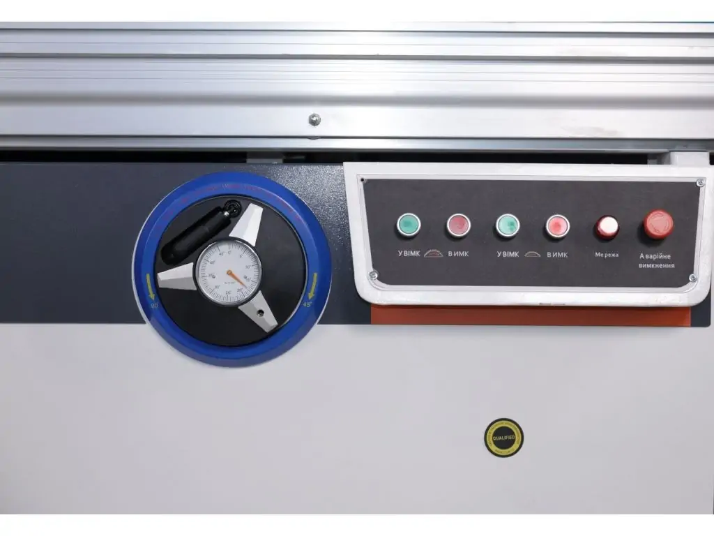 Пульт керування Дозволяє оператору швидко увімкнути/вимкнути привід пилок. Кут нахилу зручно регулюється за допомогою маховика на передній панелі верстата. На панелі встановлено кнопку аварійної зупинки верстата. |