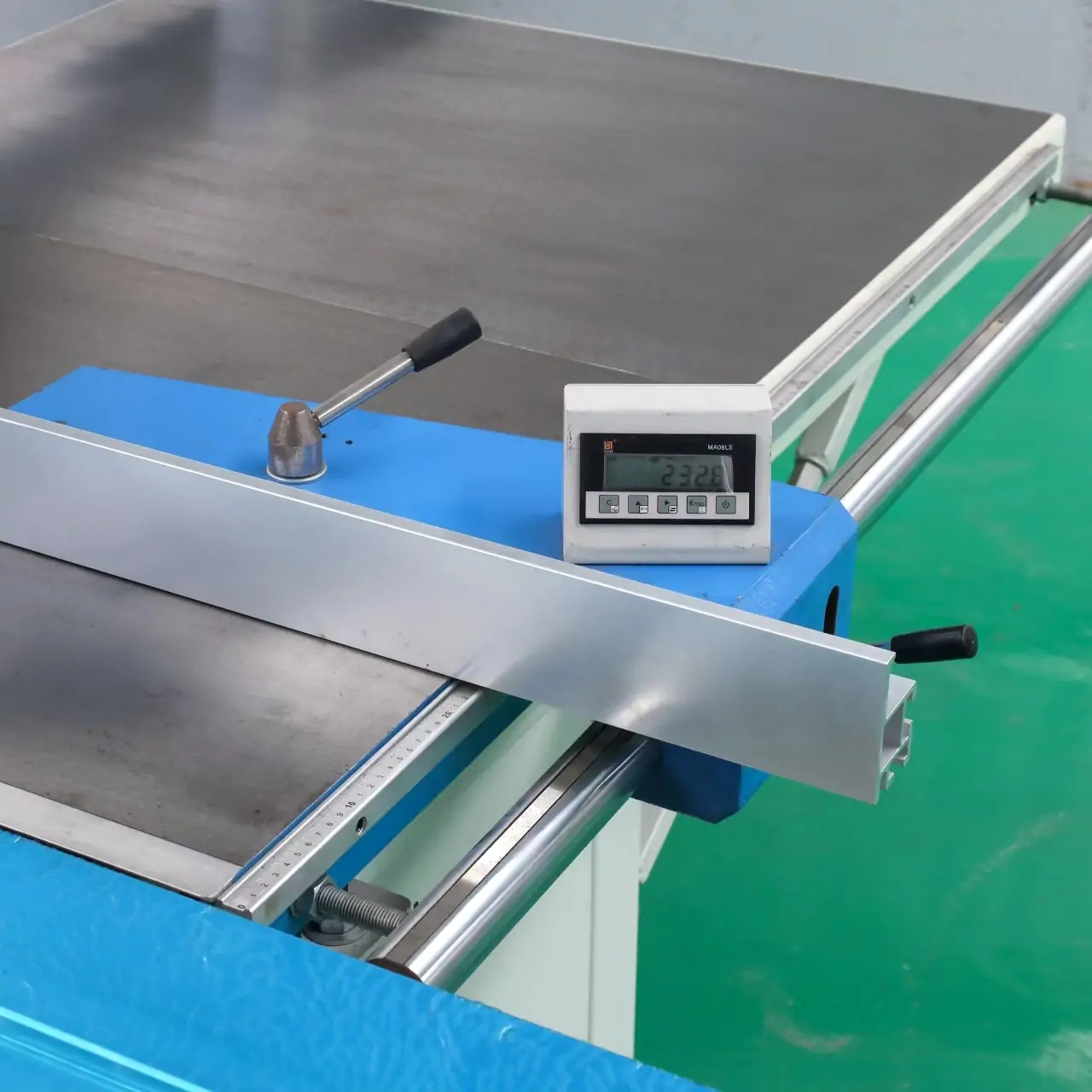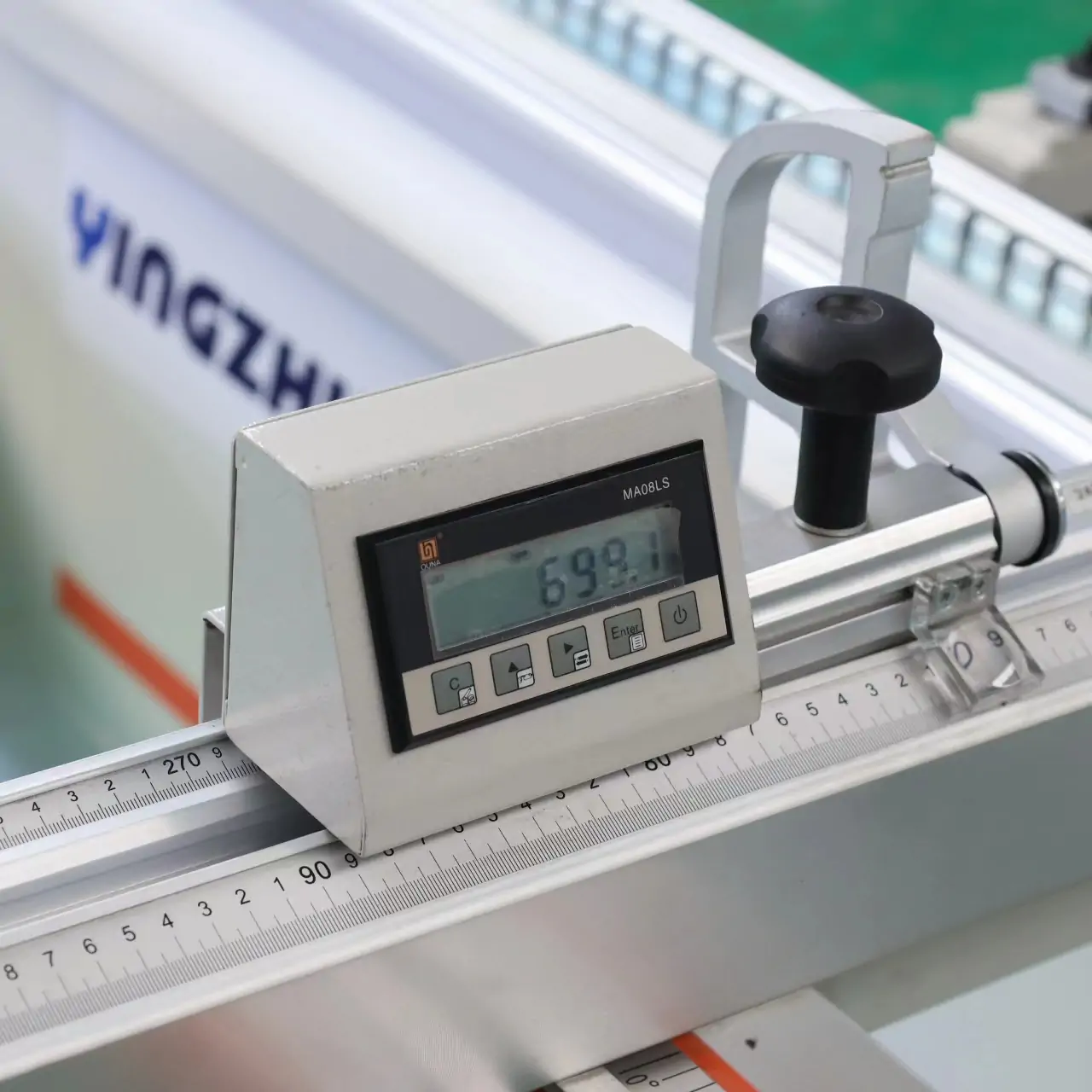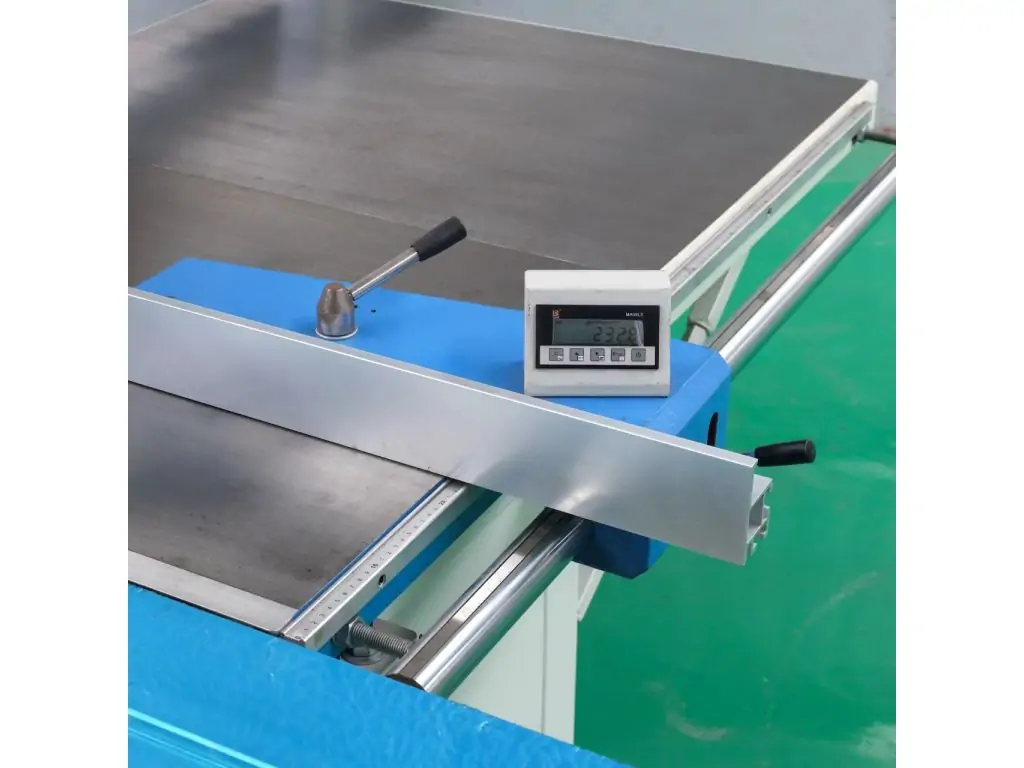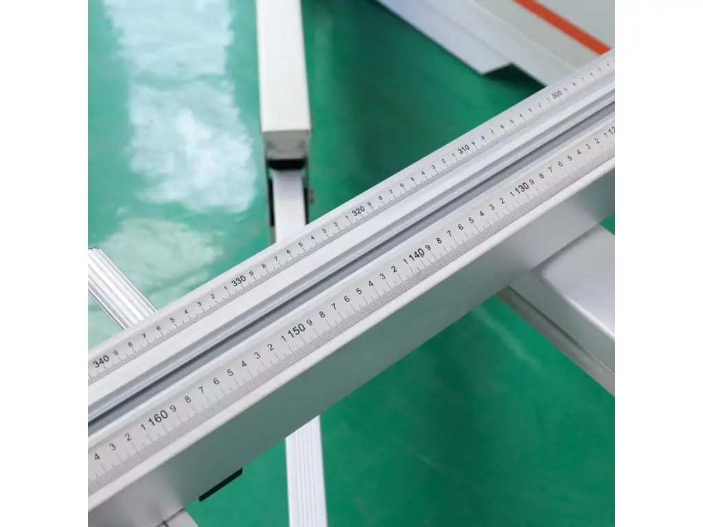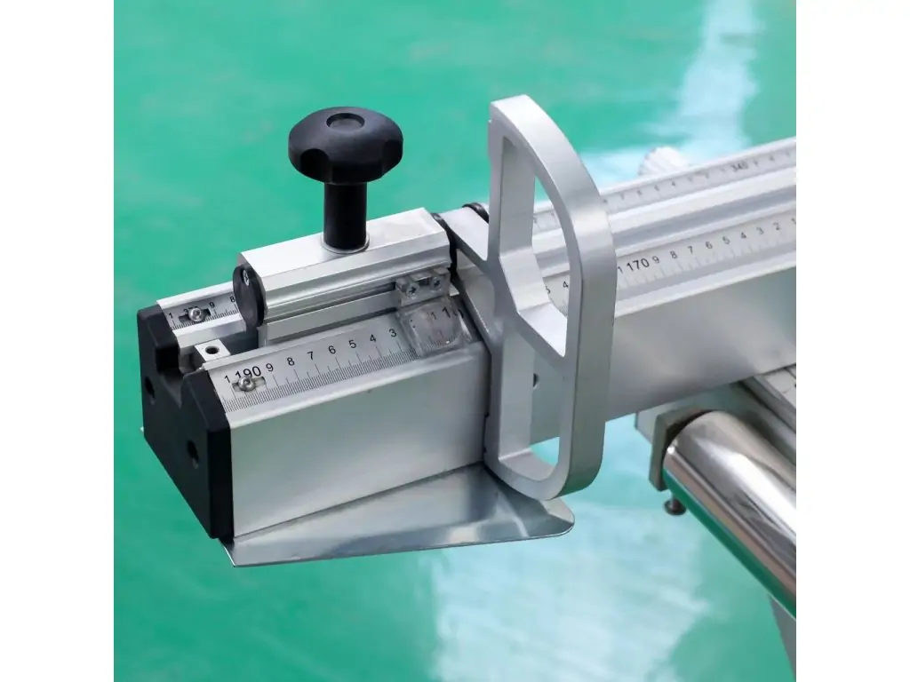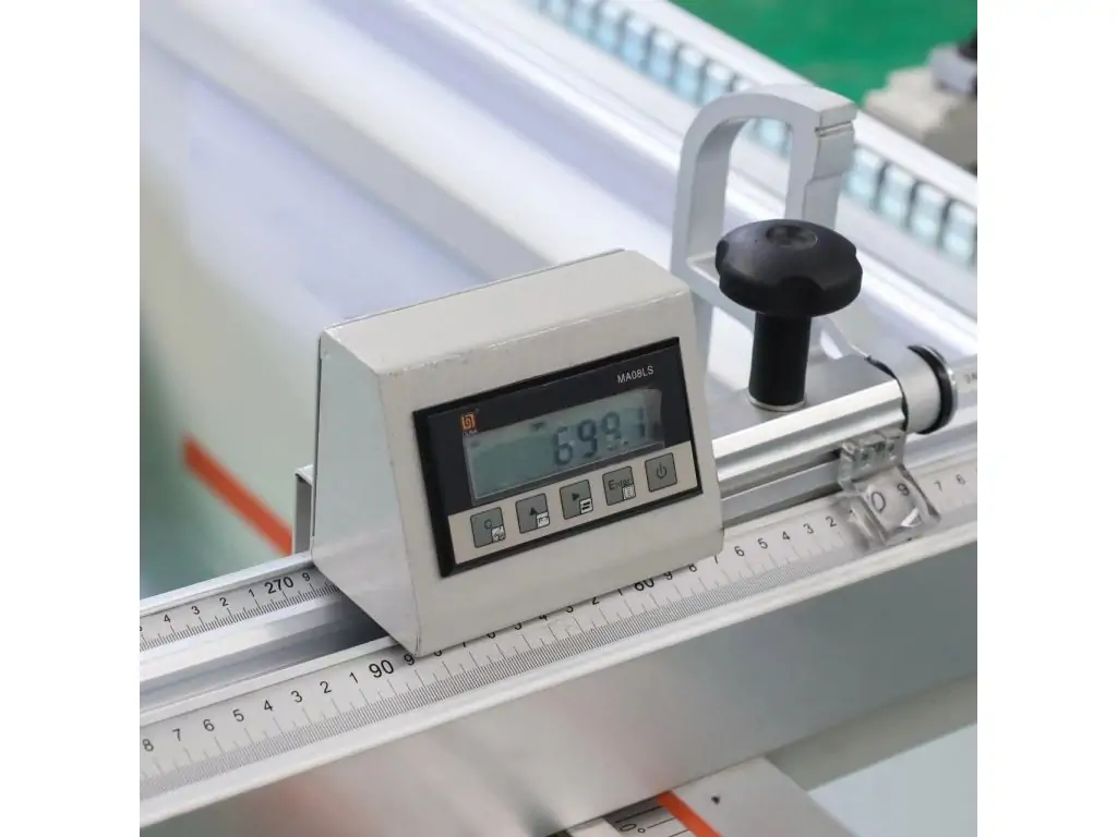 Поперечна лінійка з блоком електронної індикації Один із прапорцевих упорів на поперечній лінійці оснащений блоком цифрової індикації, що забезпечує високу точність при установці розмірів розкрою плитних матеріалів. Роздільна здатність 0,1 мм. |
