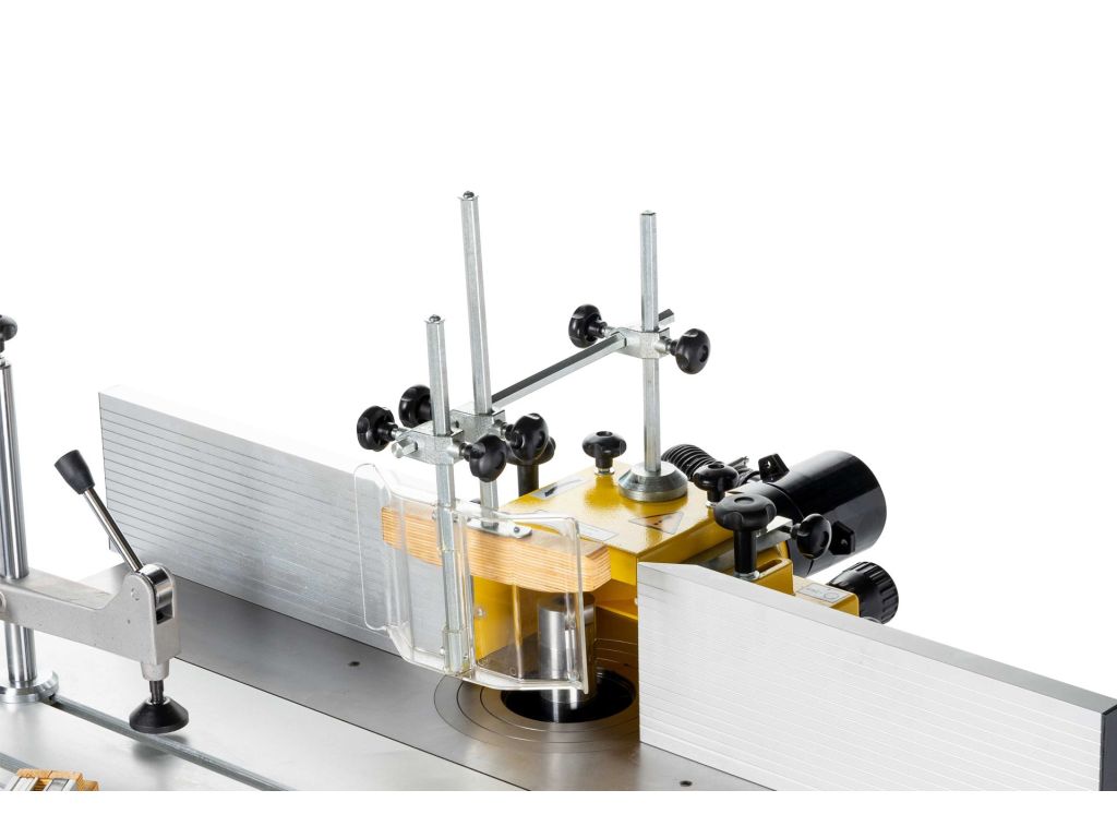 Верстат оснащений високоякісною мобільною алюмінієвою шипорізною кареткою шириною 310 мм. Масивна чавунна станина забезпечує стабільність роботи і не схильна до перекосів. Ще однією вагомою перевагою є вбудована аспіраційна установка. Також є вихід під додаткову аспірацію. Обладнання відповідає європейським стандартам якості та безпеки.