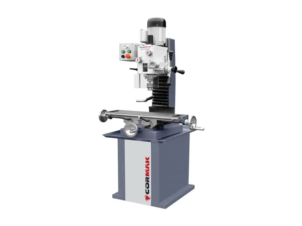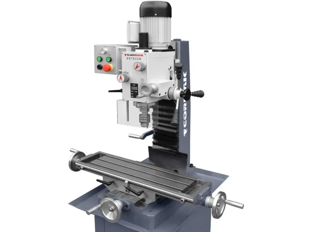 Фрезерний верстат Cormak ZX7032G можна використовувати для свердління, розгортання та розширення отворів до 32 мм у чавуні та нарізування різьблення отворів до М12, фрезерування до ширини 80 мм та фальця до 22 мм. Він також підходить для різання та торцевого фрезерування.