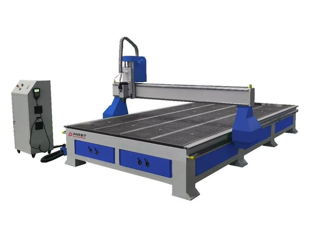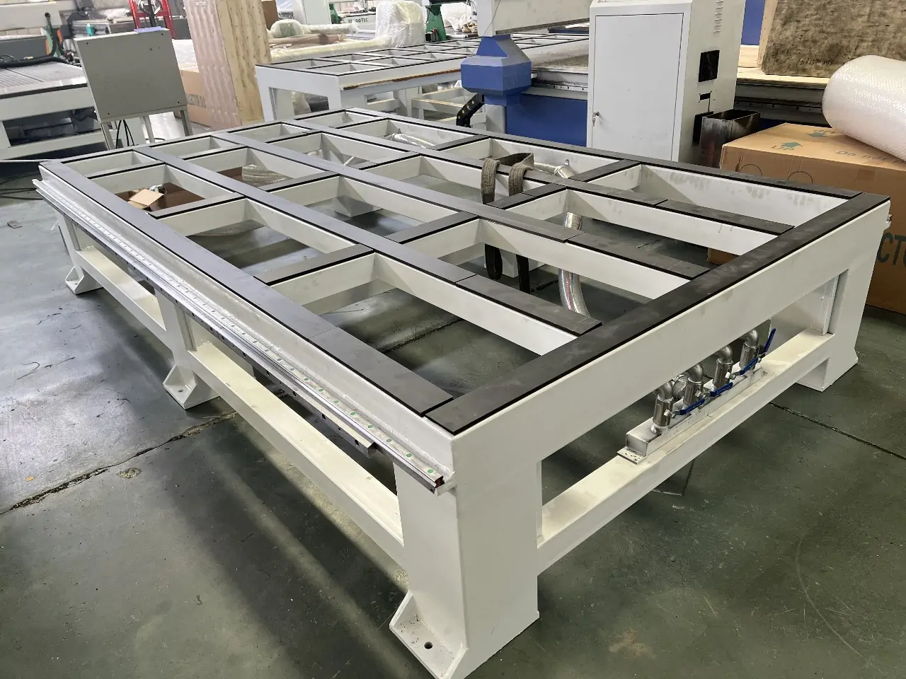 Робочий стіл верстата є синтезом вакуумного столу і алюмінієвого столу з «Т» - пазами. Така конструкція дає максимальну гнучкість та найширші можливості при виборі способу фіксації заготівлі. Вакуумний стіл розбитий на чотири зони для зручності фіксації деталей різних габаритів. Всі моделі верстатів з можливістю вакуумного кріплення заготовок мають спеціальну конструкцію столу, який дозволяє кріпити заготовку як за допомогою вакууму, так і за допомогою механічних затискачів. Це дозволяє відключити вакуумний насос і економити електроенергію у разі обробки частої зміни заготовок, що не потребує, або обгонки по периметру заготовки. Вакуумний стіл виготовляється з цільного листового матеріалу, в якому фрезеруються пази під алюмінієвий профіль для кріплення механічних затискачів (струбцин). У цій конструкції відсутні будь-які переклеювання, що гарантує стабільність роботи вакуумного столу протягом усього терміну служби обладнання.
