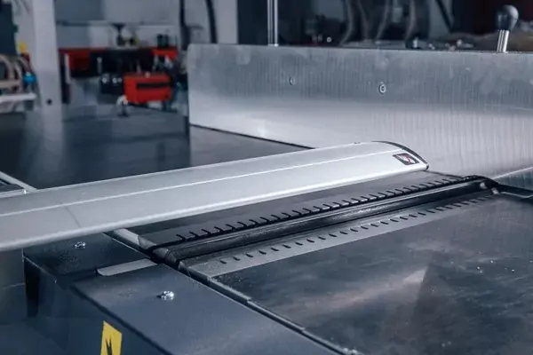 ЧАВУННА НАПРЯМНА ЛІНІЙКА Довжиною 1500 мм. Легко переміщується на зносостійких роликах, не пошкоджуючи стіл. Нахил до 45° з виставленням за кутовою шкалою дозволяє знімати фаску під потрібним кутом. Гнучкий захист закриває ножовий вал за лінійкою, що робить роботу на верстаті ще безпечнішою – норматив СЄ. |