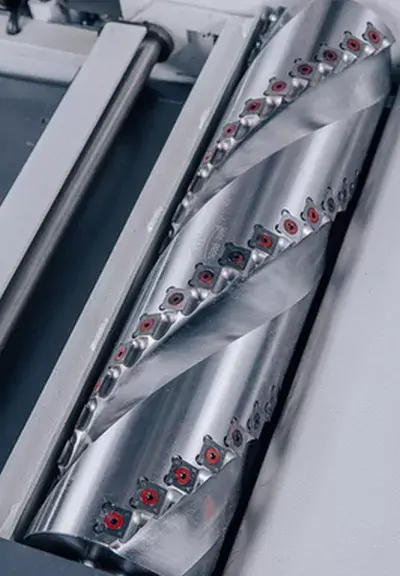СПІРАЛЬНИЙ НОЖОВИЙ ВАЛ SOFT-FORCE (ОПЦІЯ!!!) Має 3 ряди твердосплавних пластин. Ножові пластини розташовані по спіралі. Це забезпечує плавний вхід ножів у заготовку та виключає її підриви, що підвищує якість обробленої поверхні. |