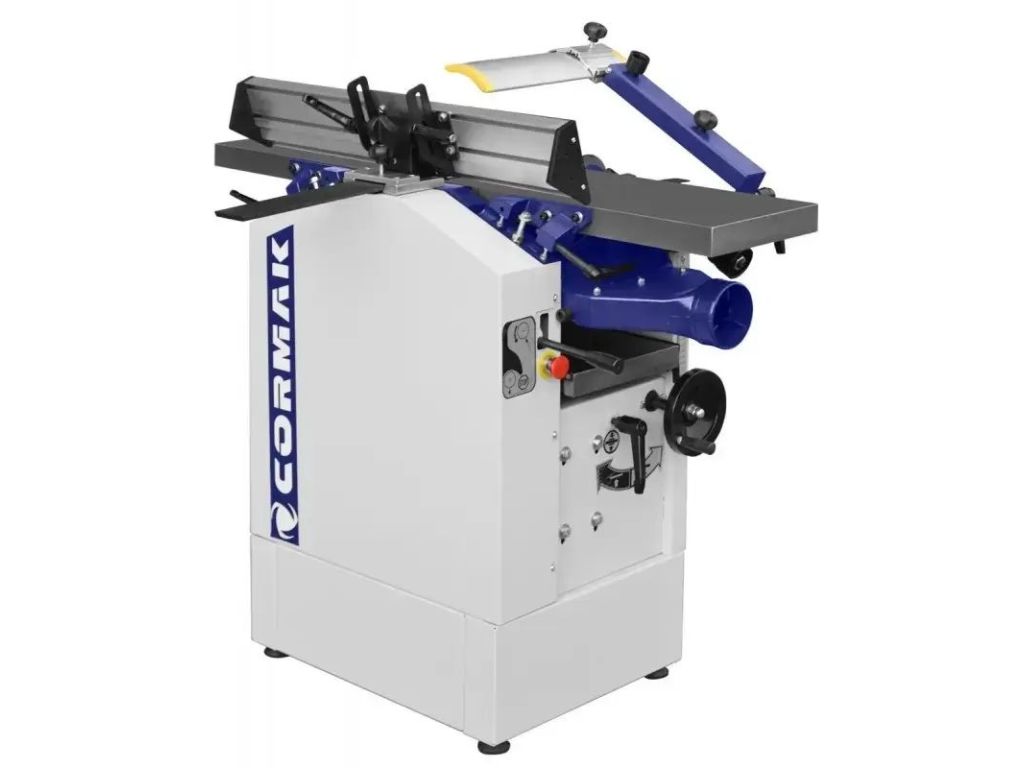 Фугувально-рейсмусовий верстат CORMAK PT260 400V з шириною обробки 250 мм, шліфованими чавунними столами та асинхронним трифазним двигуном потужністю 2 кВт/ 2,6 кВт буде вдалим вибором для невеликих професійних майстерень, які шукають багатофункціональне обладнання з якісною і точною роботою. Оснащений 3-ножовим стругальним валом діаметром 75 мм, який має швидкість обертання до 4000 об/хв. Максимальна глибина зняття за один прохід - 2,5 мм на фуганку і 3 мм на рейсмусі. Максимальна висота заготовки - 180 мм.