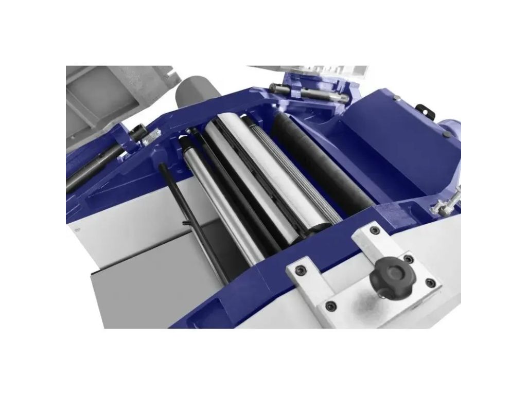 Довжина фугувальних столів 1100 мм забезпечує надійну підтримку заготовок, а шліфована, полірована поверхня столів - легке ковзання оброблюваних деталей. Завдяки жорсткій конструкції вагою 170 кг та антивібраційним гумовим ніжкам цей фуганок рейсмус 400 В гарантує точність і стабільність навіть при максимальному навантаженні.
