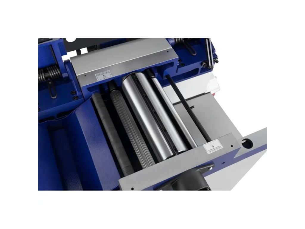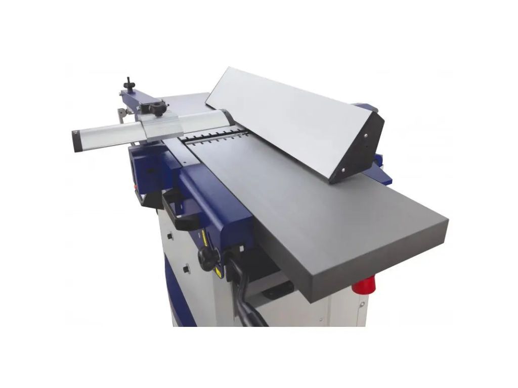 Особливістю моделі є можливість з’єднання та одночасного регулювання столів, що економить робочий час і підвищує точність обробки до 30%. Столи виготовлені з литого чавуну і мають шліфовану поверхню для легкого ковзання заготовок. Для високоточної кутової обробки використовується алюмінієвий маятниковий упор з кутом нахилу 90-45°. Цей рейсмусово фугувальний верстат 250 мм поєднує компактність і промислову потужність, тому буде ідеальним вибором для професійних майстерень з обмеженою робочою площею.