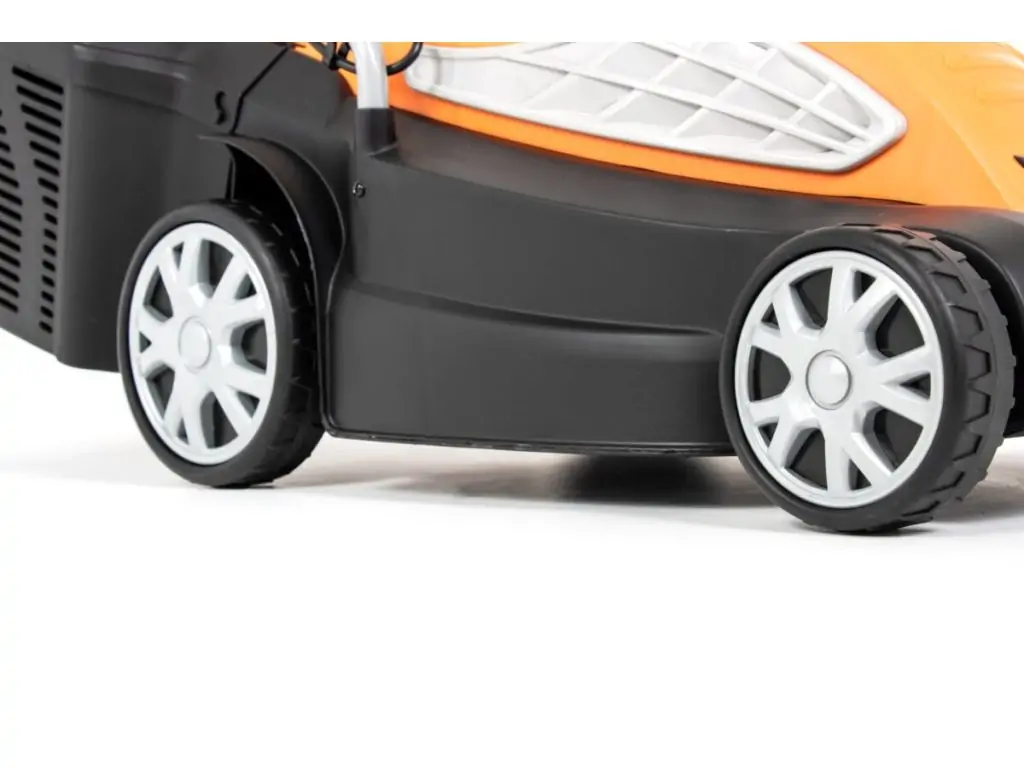 Корпус газонокосарки виконаний з ударостійкого пластику. Ергономічна ручка для управління з покриттям софт-тач у точці захвату не ковзає у руках і дозволяє зручно керувати технікою. Міцні колеса легко проїжджають по траві, забезпечуючи максимальний комфорт використання. Для запобігання несправностям є захист від перегріву. Проста в експлуатації, легка та маневрена, ця електрична газонокосарка не потребує значних фізичних зусиль чи спеціальних навиків.
