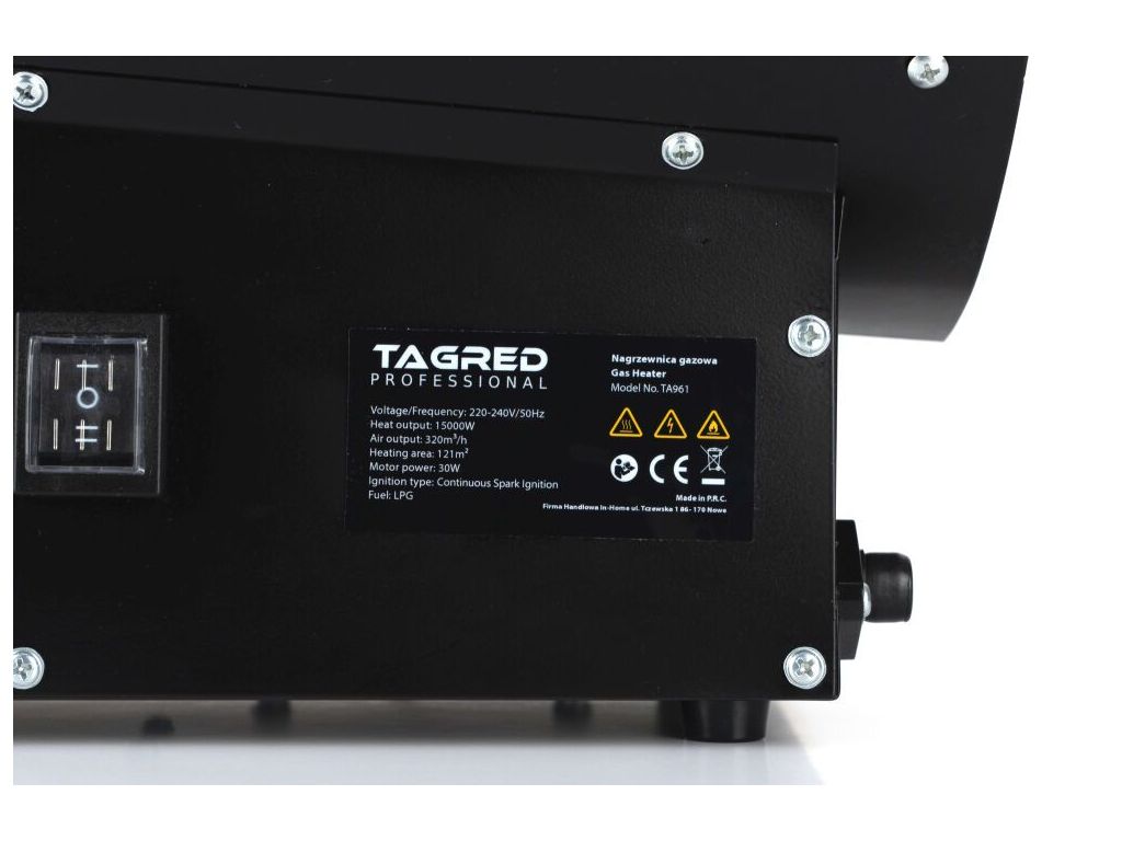 Газовий обігрівач TAGRED TA961 - портативний прилад, призначений для обігріву складських, виробничих і підсобних приміщень. Обігрівач працює на газі пропан-бутан. Пристрій має численні засоби захисту, включаючи захист від перегріву та витоку газу . Встановлений LCD дисплей.