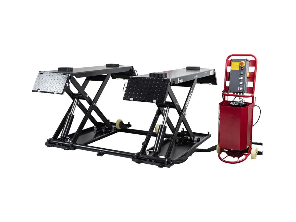 Гідравлічний механізм забезпечує плавне та контрольоване підняття вантажу. Час підйому/опускання становить 35 с. Пандуси з рифленою поверхнею полегшують заїзд автомобіля на платформи. Довжина платформ без пандусів - 1480 мм, з пандусами - 2080 мм. Цей компактний автомобільний підйомник у складеному стані займає мало місця і оснащений колесами, що робить його зручним для зберігання і переміщення.