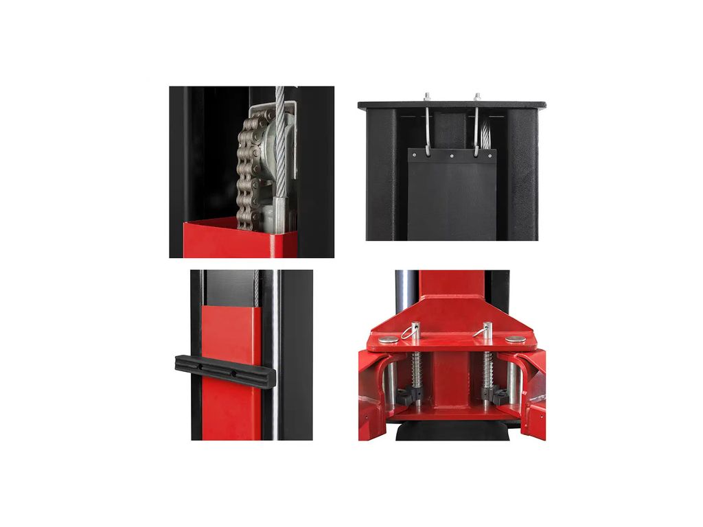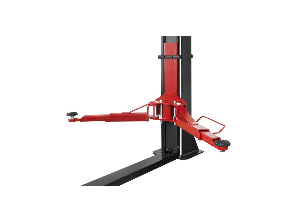 Підйомник має нижню синхронізацію і оснащений трифазним двигуном потужністю 2,2 кВт, який забезпечує швидкість підйому близько 55 с. Асиметричні телескопічні лапи (розмах передніх - 620-880 мм, задніх - 820-1260 мм) дозволяють працювати з авто з різною колісною базою, а мінімальна висота лап 90 мм підходить для низьких автомобілів. Завдяки автоматичному розблокуванню запобіжних замків, цей автомобільний підйомник з розеткою економить час і зусилля оператора, а ряд систем безпеки робить його надійним і довговічним.