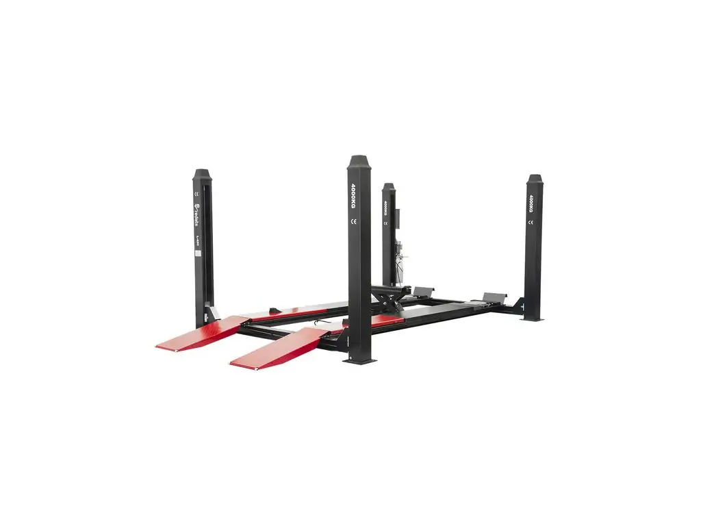 Напівавтоматичний чотириколонний підйомник REDATS L-420 з вантажопідйомністю 4 тонни розроблений для професійних автосервісів, які займаються регулюванням геометрії коліс і загальним сервісним обслуговуванням легкових автомобілів, мікроавтобусів і легкої комерційної техніки. Рампи оснащені поворотними дисками для точного регулювання передньої осі автомобіля та задніми розсувними пластинами для горизонтального руху задньої осі авто при вимірюванні розвал-сходження. Спеціальні кришки дозволяють змінити положення поворотних дисків та закрити ніші підйомника. В комплект поставки входить траверса вантажопідйомністю 3 тонни.