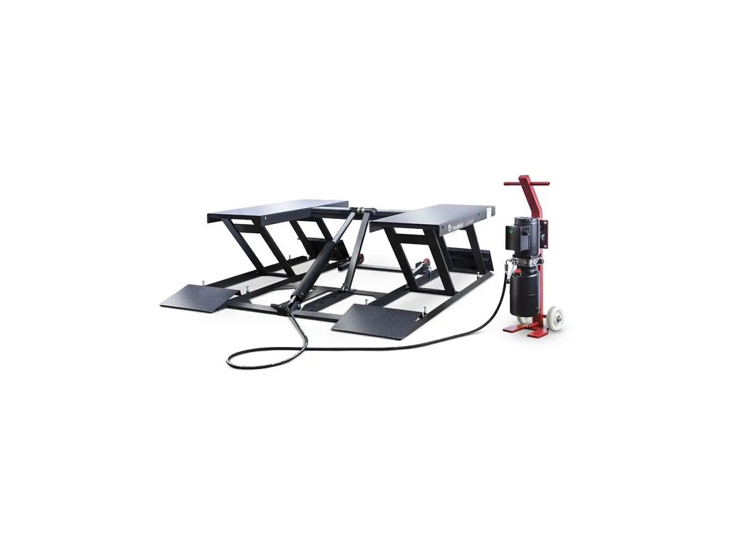 Підйом і опускання займають всього 25 с і виконуються натисканням кнопки. Платформа оснащена заїзними смугами зі спеціальними канавками для полегшення заїзду автомобіля. В комплект поставки входять 4 гумові накладки, які запобігають ковзанню авто при підйомі і захищають його несучі частини. Міцна металева конструкція робить цей портативний підйомник для авто надзвичайно довговічним. Цей підйомник повністю мобільний. Ви можете легко перемістити його в будь-яке місце у Вашій майстерні!