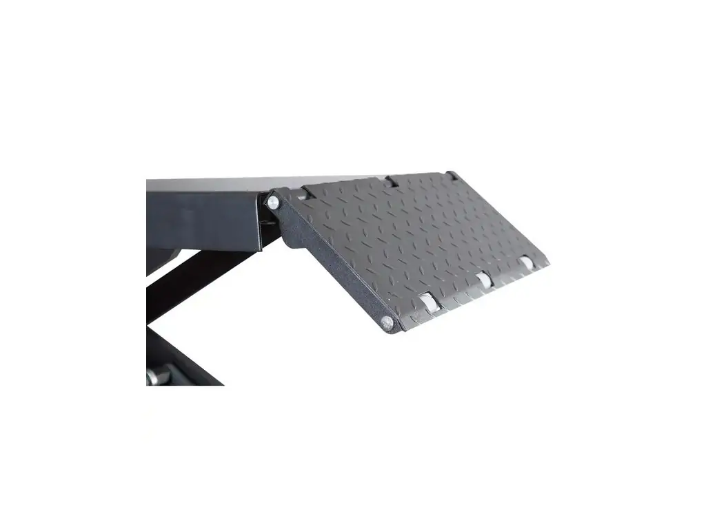 Дві незалежні платформи довжиною 1450 мм (без пандусів) дозволяють підняти автомобіль під потрібним кутом для обслуговування гальмівної системи, підвіски чи інших механізмів. Рифлені пандуси забезпечують легкий заїзд авто на платформи. Панель управління складається з 3 кнопок - підйом, опускання і фіксація у потрібному положенні, тому керування підйомником надзвичайно легке. Цей ножичний підйомник для СТО поставляється з 4 гумовими накладками для запобігання пошкодженню елементів автомобіля.