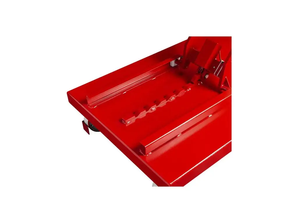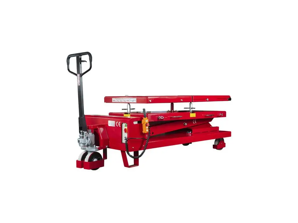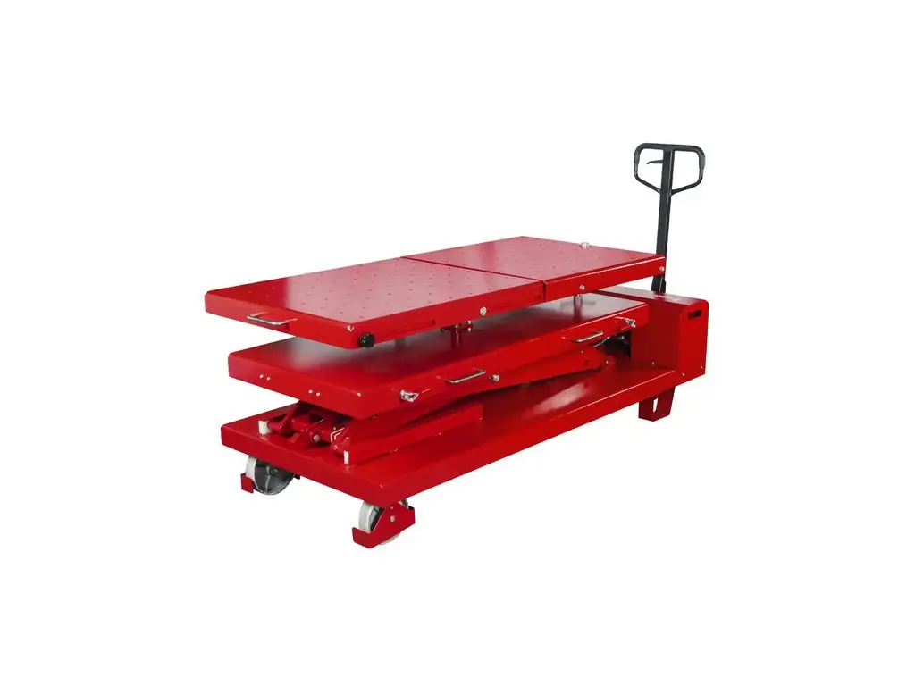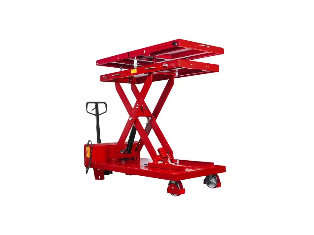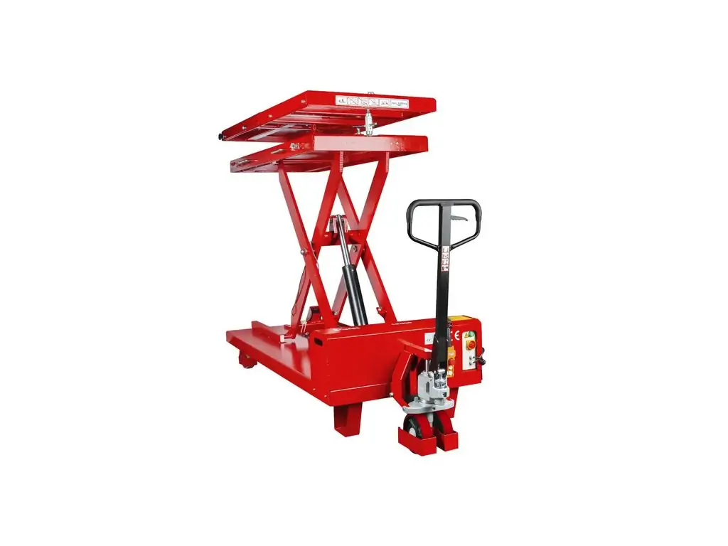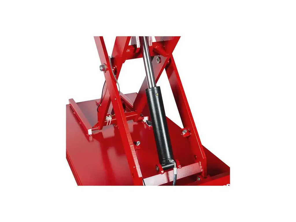 Можливість нахилу платформи в різних напрямках (вперед, назад, вліво, вправо, поперек) дозволяє точно позиціонувати її під компонентами. Електрогідравлічне керування забезпечує точний контроль швидкості підйому-опускання і положення платформи. Живлення від напруги 230 В дає змогу підключити пристрій у майстерні без трифазної мережі. Цей підйомник для акумуляторів та двигунів оснащений колесами, тому його можна легко переміщати по робочій зоні.