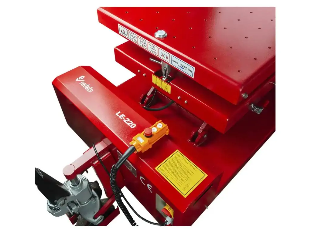 Підйомник ножичний REDATS LE-220 з вантажопідйомністю 1200 кг розроблений для підйому двигунів, трансмісій, акумуляторів та інших важких компонентів автомобілів. Мінімальна висота платформи становить 800 мм, висота підйому до 1800 мм дозволяє підняти компонент на висоту грудей або очей для зручного монтажу/демонтажу. Швидкість підйому/опускання без навантаження - 54/58 с. Підйомна платформа має розмір 800х1750 мм (ШхД), завдяки телескопічним сегментам довжину платформи можна збільшити до 2050 мм.