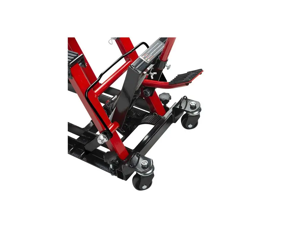Міцна сталева конструкція має високу стійкість до деформацій і пошкоджень, а широка основа гарантує стійкість до перекидання. Для захисту транспортних засобів підйомні опори оснащені гумовими накладками. Для безпечності роботи є запобіжні засувки. Опційно можна замовити ремені для фіксації транспортного засобу при підйомі. 4 колеса (2 з яких поворотні) і ручка роблять цей підйомник для мотоциклів надзвичайно мобільним.