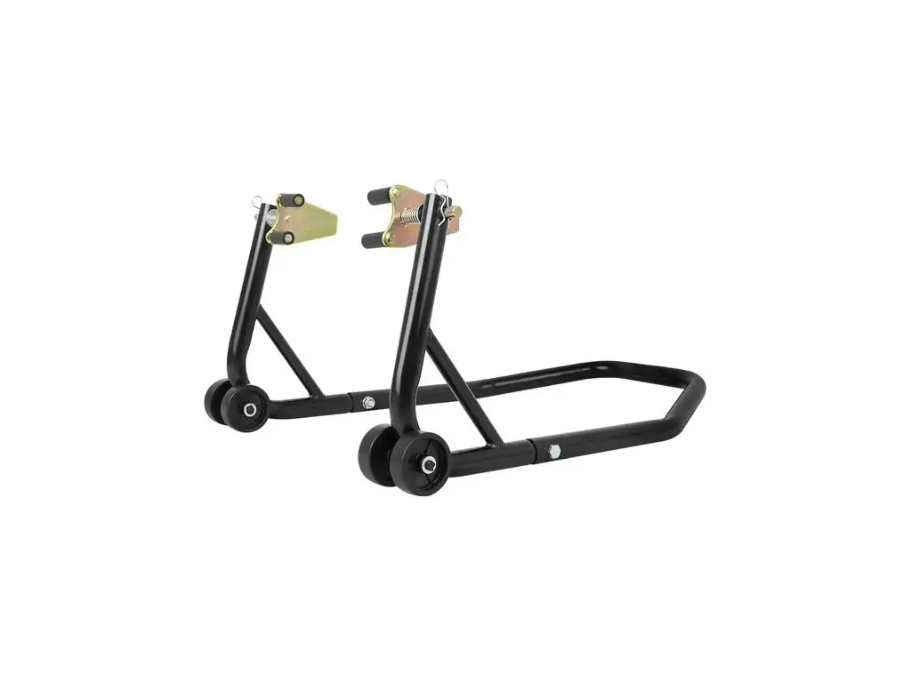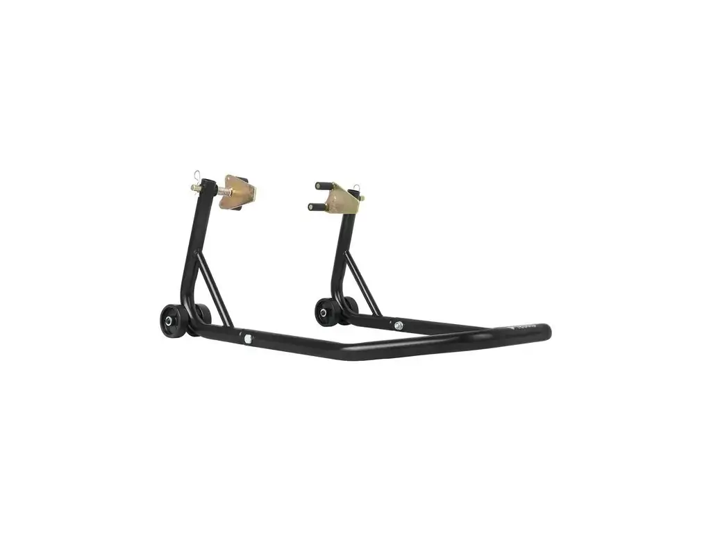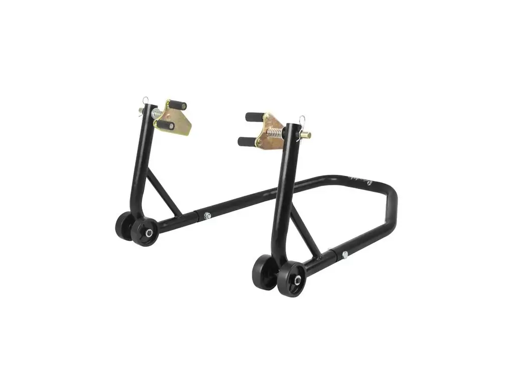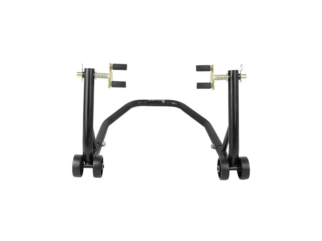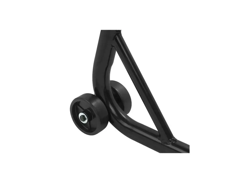 Конструкція виготовлена з міцних сталевих труб діаметром 32 мм, що гарантує її стійкість та стабільність піднятого мотоцикла. Підставка покрита захисною фарбою чорного кольору, завдяки чому зберігає привабливий зовнішній вигляд навіть у складних умовах експлуатації. Подвійні роликові колеса зі зносостійкого пластику мають діаметр 75,5 мм, що дозволяє легко переміщати стійку навіть по нерівних поверхнях. Для захисту рук від травмування ця підставка під мотоцикл оснащена спеціальними ручками.