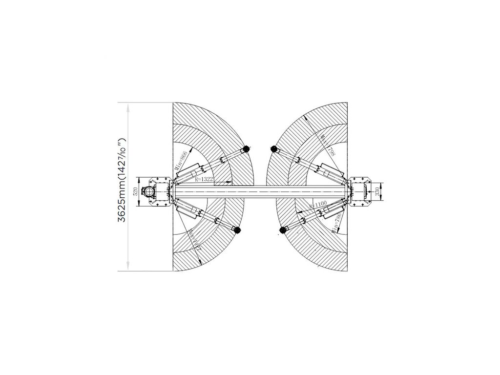 У підйомниках з симетричною конструкцією усі 4 телескопічні лапи мають однакову довжину. При підйомі центр ваги автомобіля розташований строго симетрично щодо середньої лінії. Це забезпечує максимальну стійкість та рівномірний розподіл навантаження, але не дозволяє відкрити двері авто.