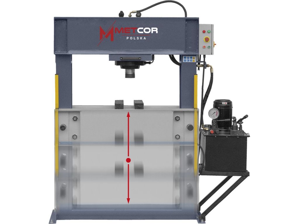 Гідравлічний прес METCOR HPP-100 - це професійне промислове обладнання для пресування, згинання, штампування, рихтування та інших операцій по обробці металоконструкцій під тиском, яке забезпечує зусилля до 100 тонн. Гідравлічна система приводиться в рух електродвигуном потужністю 3 кВт, що забезпечує високу швидкість та ефективність обробки. Хід поршня становить 250 мм, хід столу - 405 мм. Плавне регулювання висоти робочого столу дозволяє адаптувати прес до різних типів операцій.